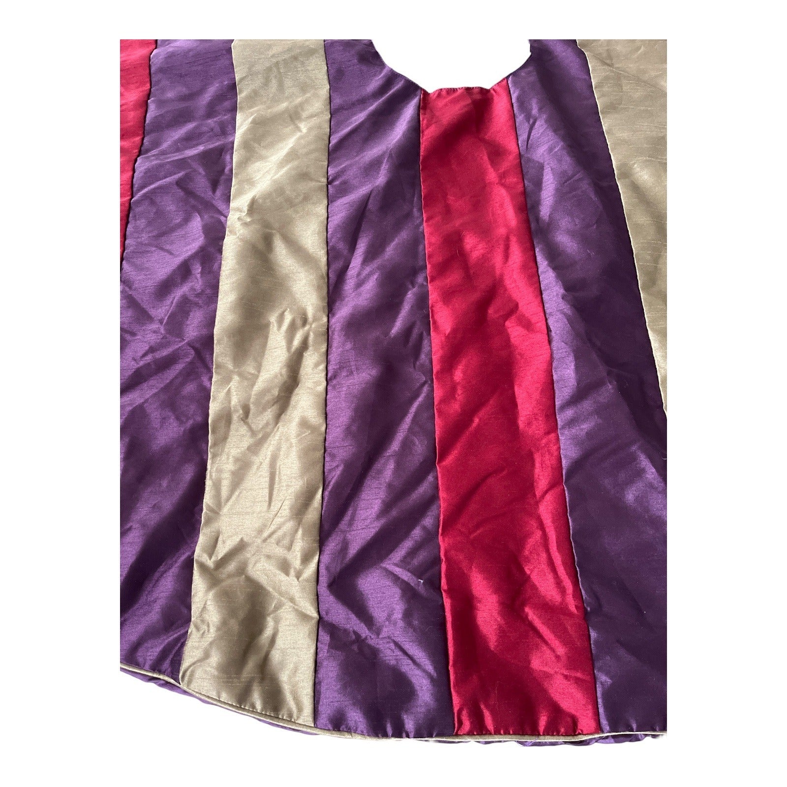Early-2000s vintage Christmas tree skirt by Rodeo Home featuring wide vertical satin-finish stripes in rich burgundy red, plum purple, and muted gold. Designed with a center opening and tie closure for easy placement around the tree base. Fully lined with a solid plum backing and light padding for structure and drape. A classic example of early-2000s holiday décor with jewel-tone color blocking popular during the period.