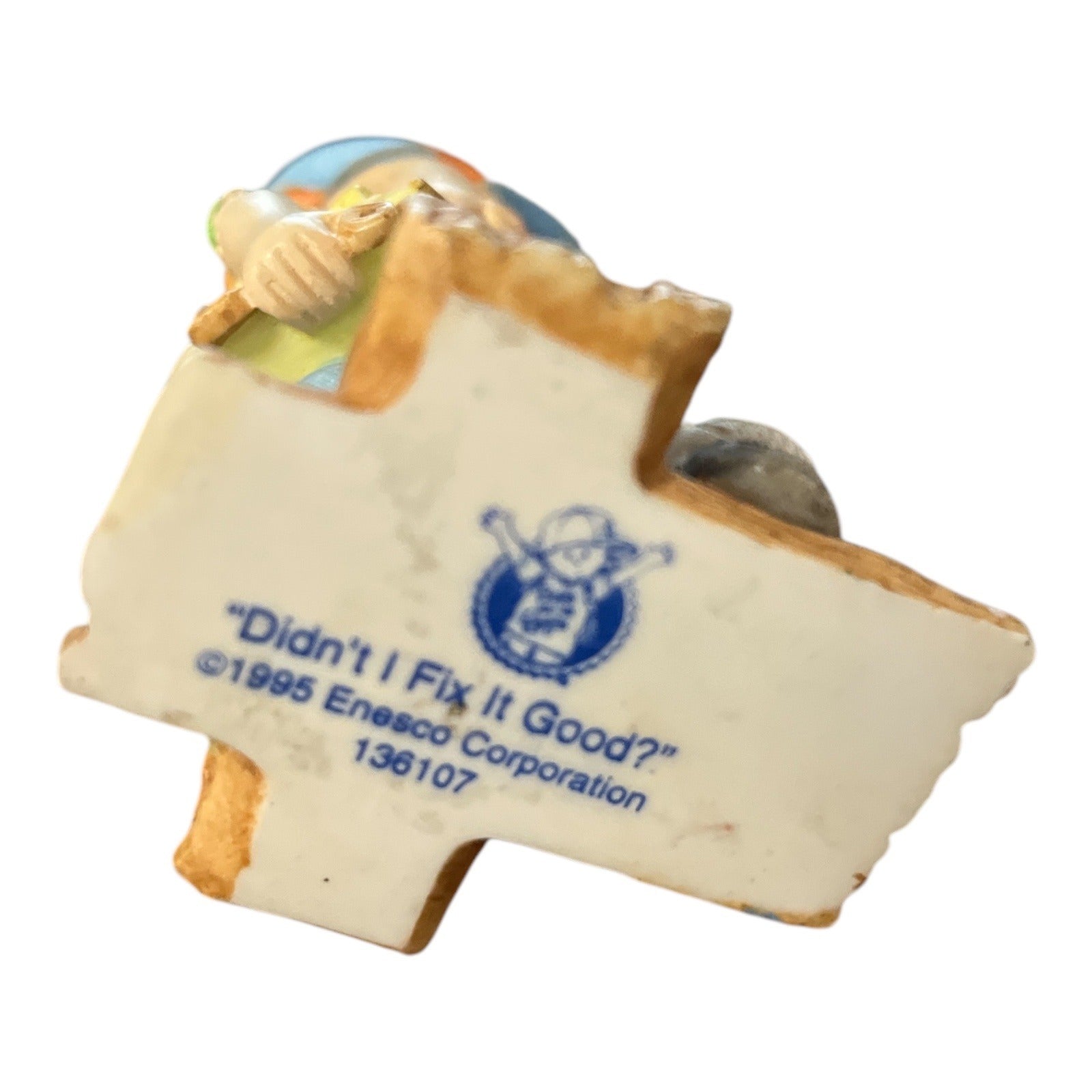 Charming 1995 Enesco figurine titled “Didn’t I Fix It Good?” featuring a sweet little boy carpenter holding a tool and wooden project. Detailed with textured overalls, tool belt, hammer, and #1 Kid shirt detail on the back. A nostalgic 90s collectible with classic Enesco craftsmanship.