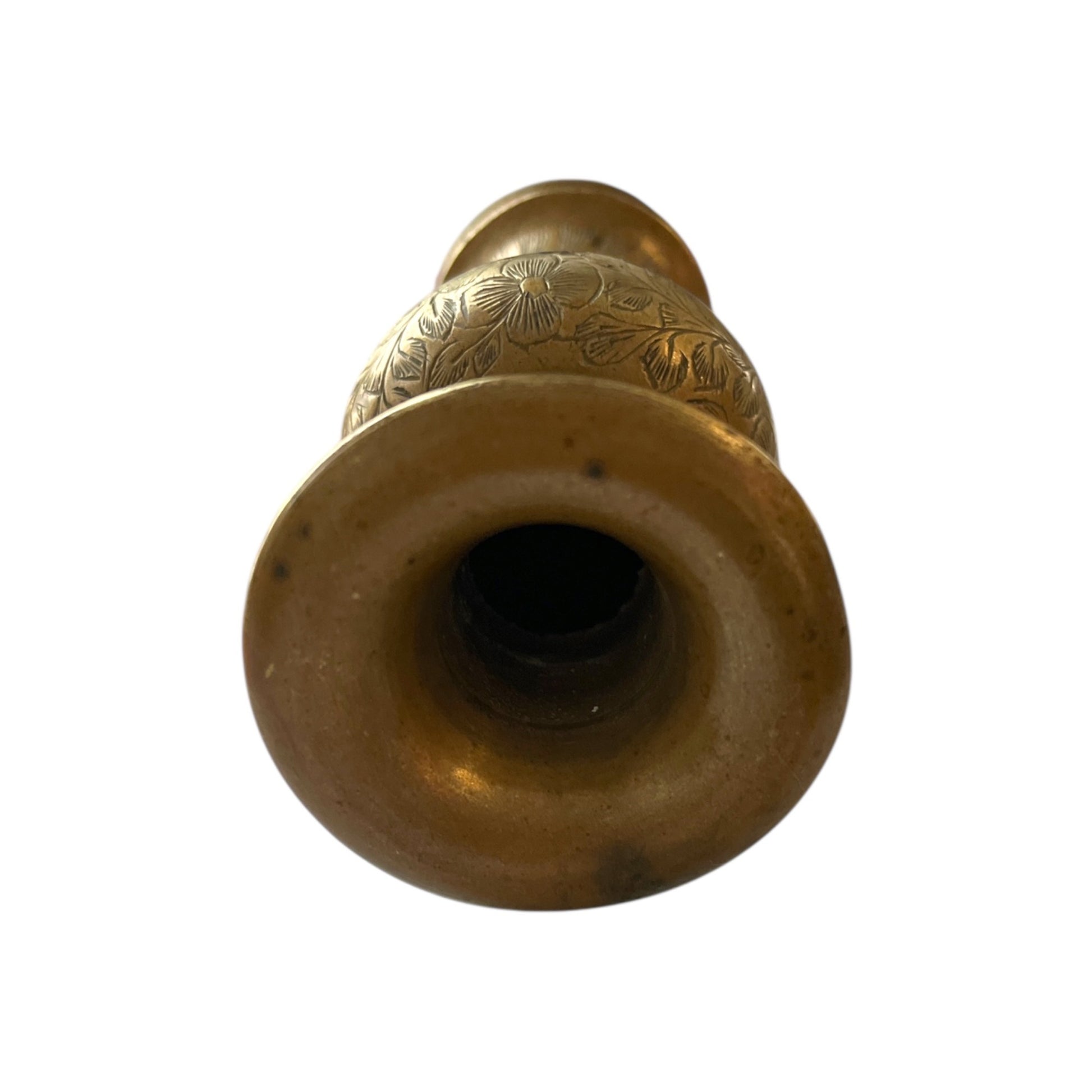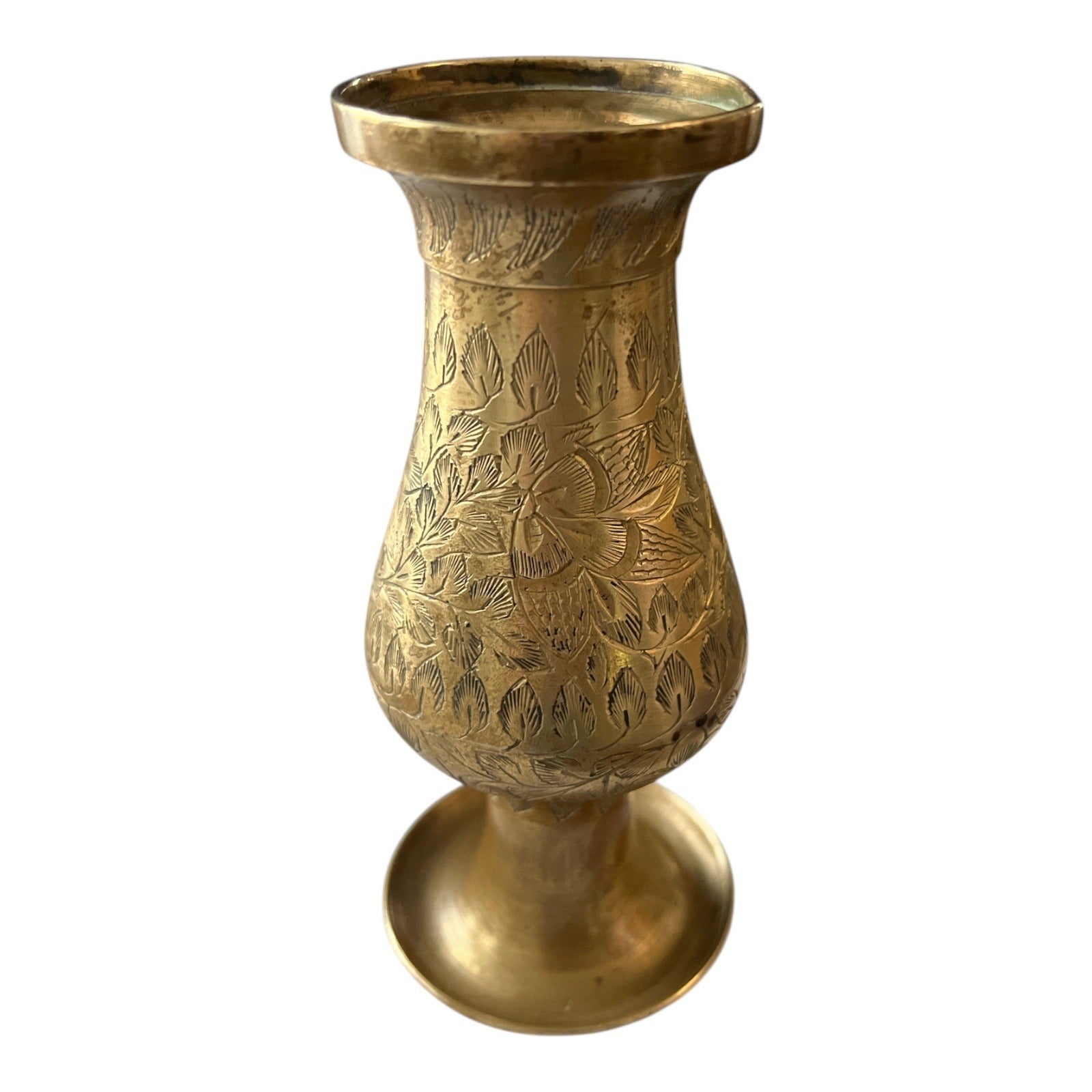 This elegant vintage brass candle holder features a beautifully etched floral design with intricate detailing. Measuring approximately 5 inches tall and 2.5 inches wide at the base, it makes a charming accent for a shelf, table, or windowsill. The vase shows a warm, aged patina with minor tarnish and some wear consistent with age.