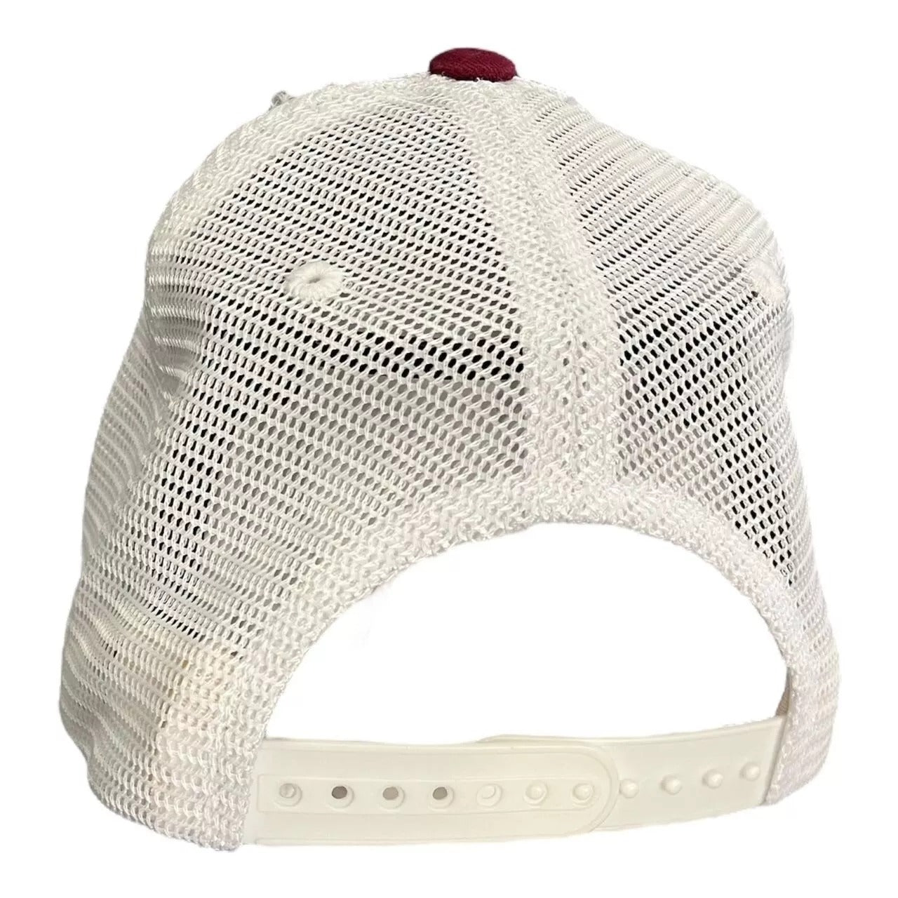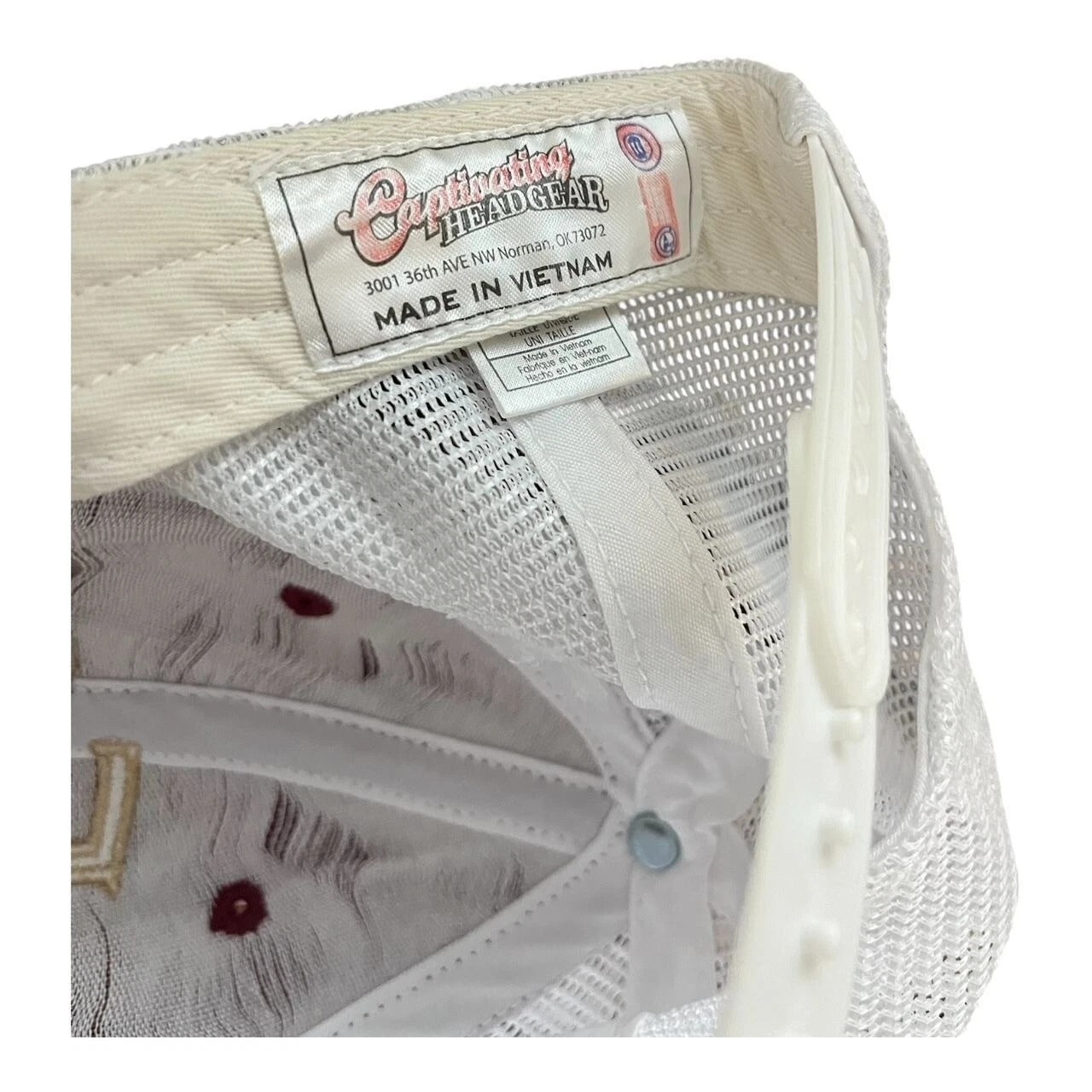 * White Mesh Trucker Hat by *Captivating Headgear* (Made in Vietnam) – Front panel is noticeably misshapen from storage but may be restorable with steam or reshaping. Features a burgundy top button, mesh back, and adjustable snapback closure.