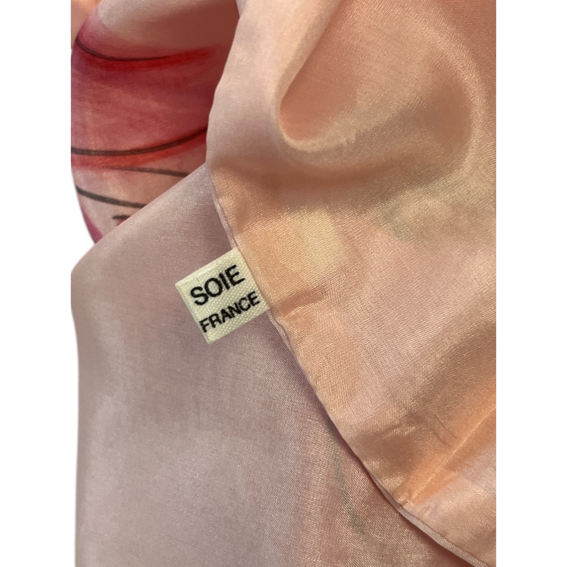 While specific information on the designer is limited, the scarf is signed in a style typical of **Parisian boutique or department store lines** from the late 1980s to early 1990s. Many such scarves were produced in France using high-quality silk and featured hand-painted or screen-printed floral motifs, often sold under first-name or private-label brands exclusive to shops.