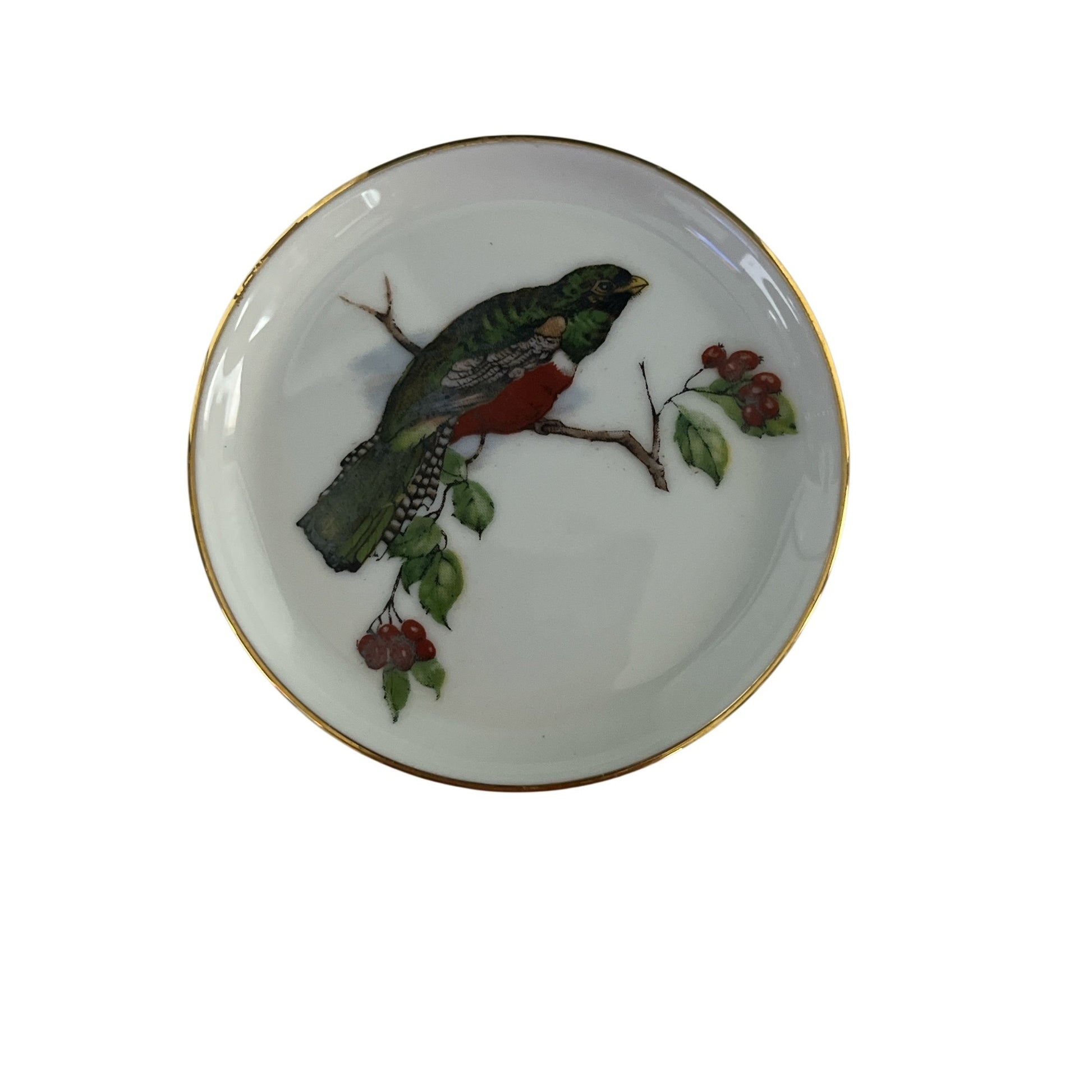 Set of two small vintage porcelain trinket dishes by **Fürstenberg Porcelain**, featuring finely detailed bird illustrations perched on flowering branches. Each dish is finished with a delicate gold rim and glossy white glaze. The designs coordinate beautifully while each bird illustration is unique, making this a charming display or vanity set.