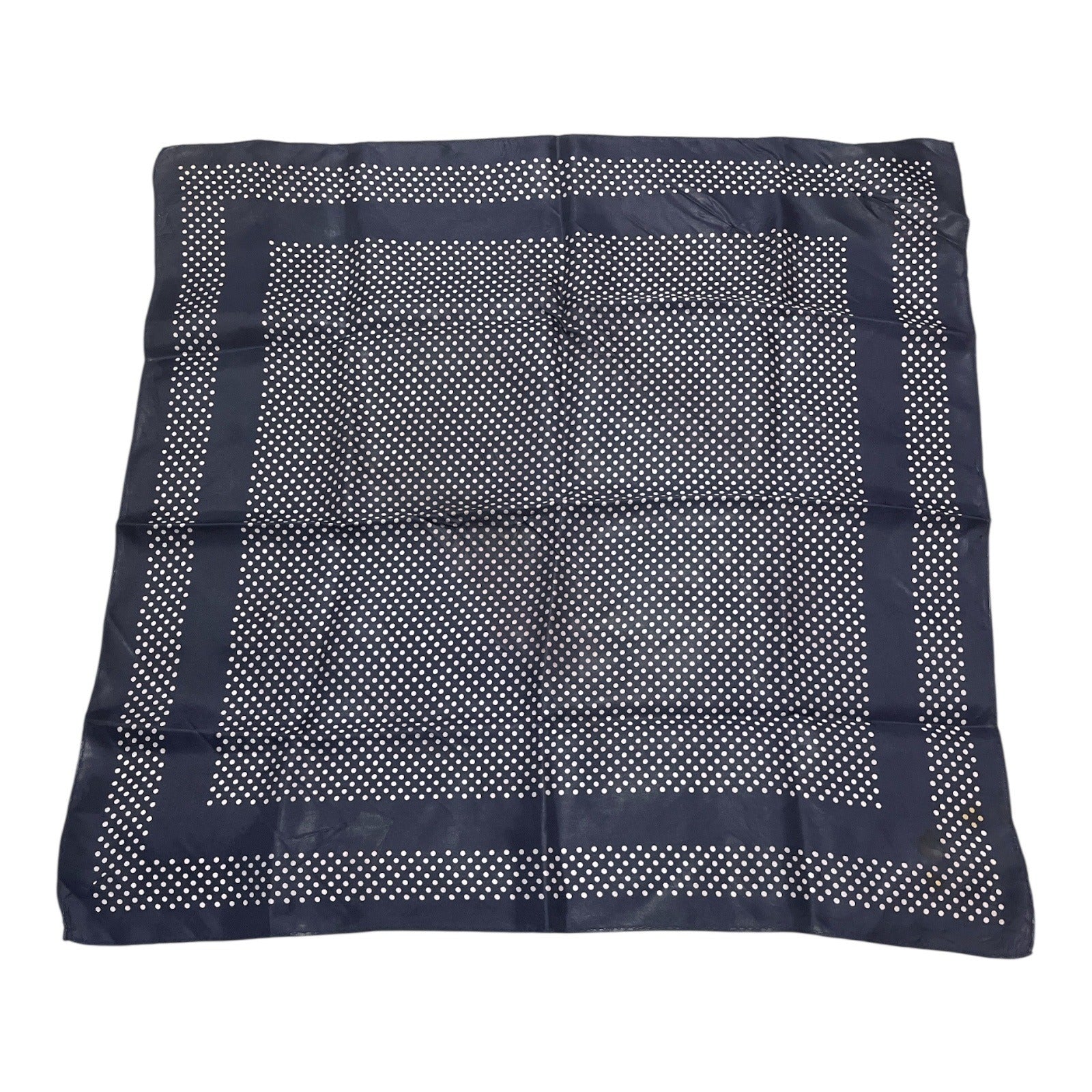 Classic and timeless, this vintage Glentex scarf features a navy blue background with a crisp white polka dot pattern. Made in Japan from 100% acetate, it has a soft, silky feel and a lightweight drape—perfect for wearing around the neck, as a headscarf, or tied to a handbag for a chic accent.