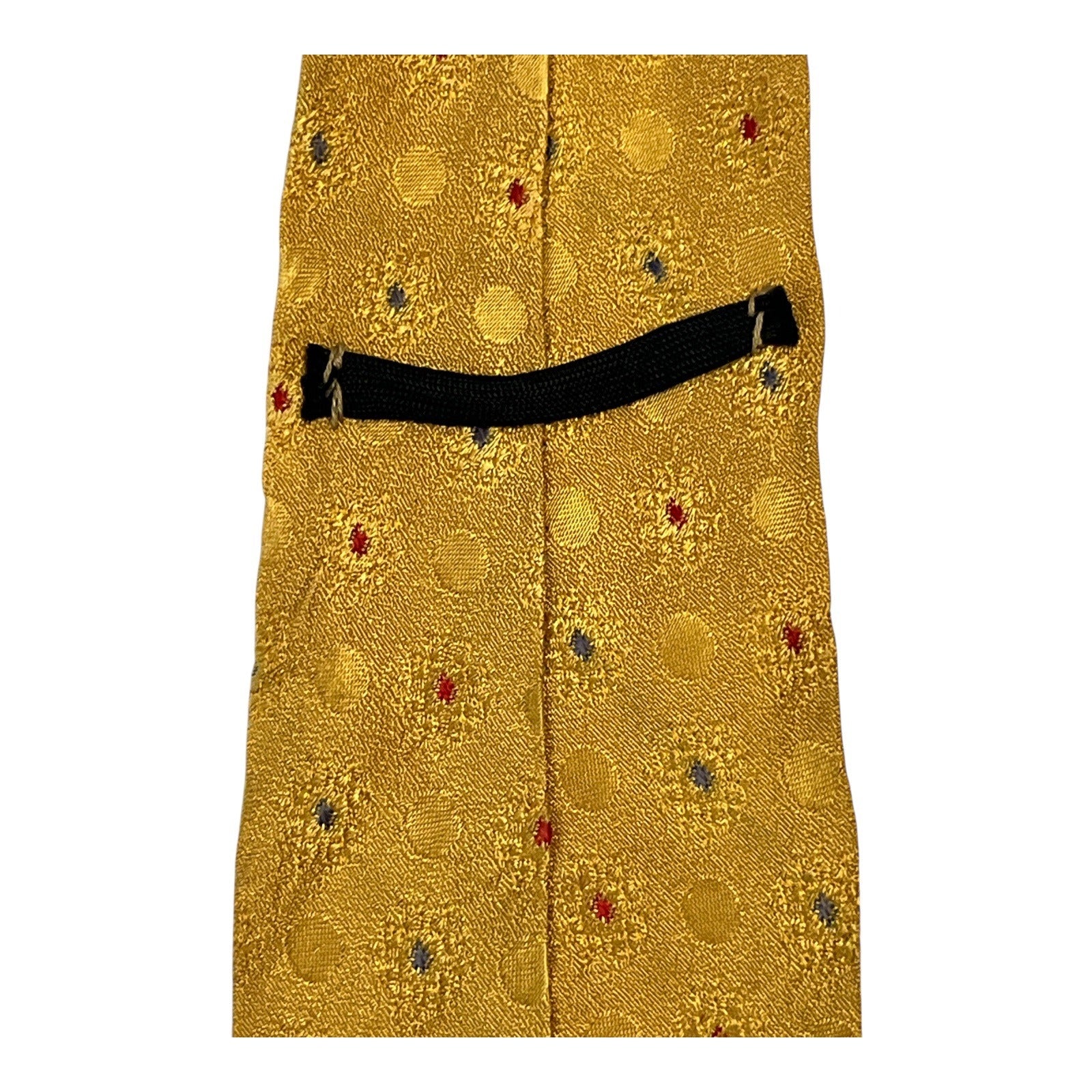 A bold statement accessory, this vintage men’s tie features a golden yellow background with a subtle woven dot pattern accented by small red and blue stitched details. The sheen and geometric motif give it a distinctly retro mid-century look.