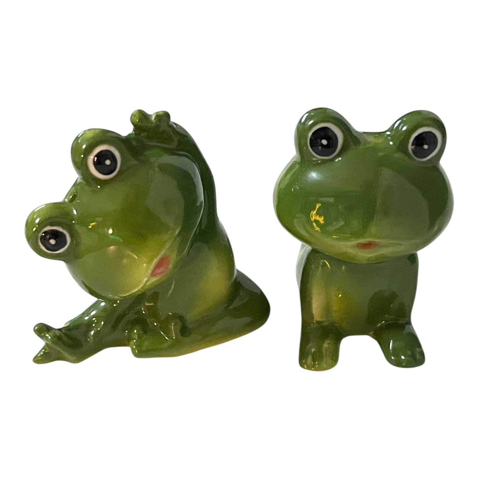Charming vintage ceramic salt and pepper shaker set featuring two glossy green anthropomorphic frogs. Each frog has expressive eyes and a playful pose, making this set a fun addition to a kitchen, dining table, or frog-themed collection. Shakers are unmarked but well-crafted, with bottom fill holes and original stoppers.