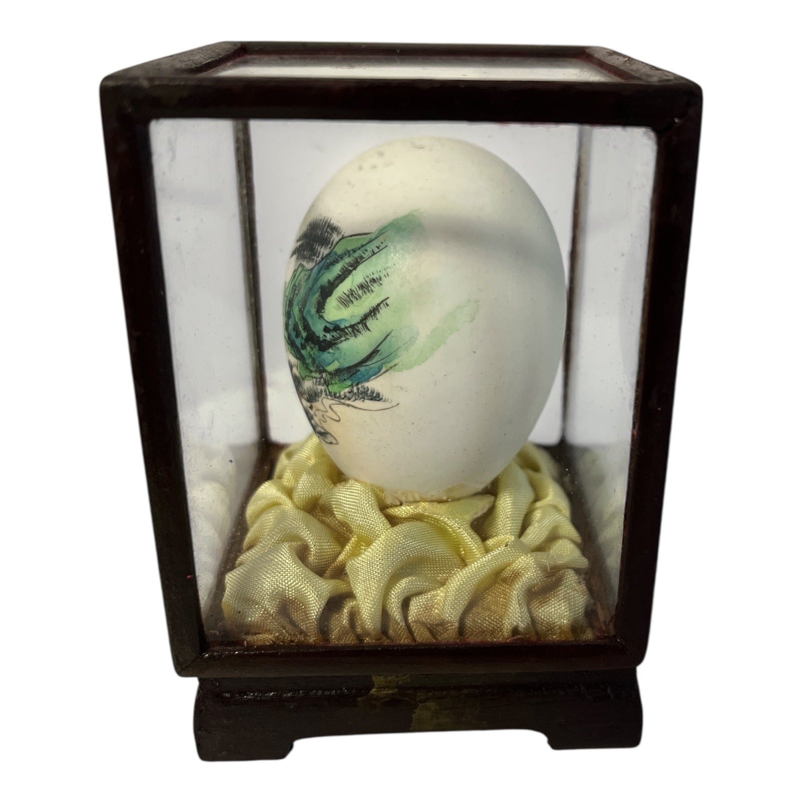 Vintage Hand-Painted Chinese Scenic Egg in Glass Wood Display Case