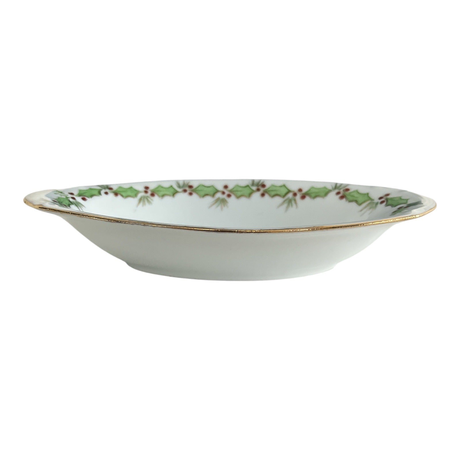 Vintage Hand-Painted Christmas Holly Oval Porcelain Bowl – Gold Trim