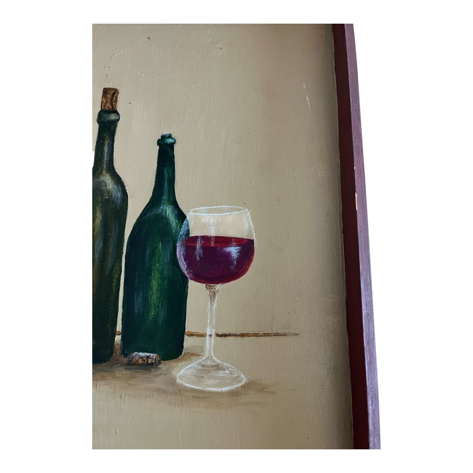This vintage wooden serving tray features a hand-painted still life of two green wine bottles and a glass of red wine, signed by the artist *Irene*. The burgundy frame beautifully borders the painted centerpiece, giving it rustic charm. Both decorative and functional, this tray is perfect for entertaining, a bar area, or as a unique wall display.