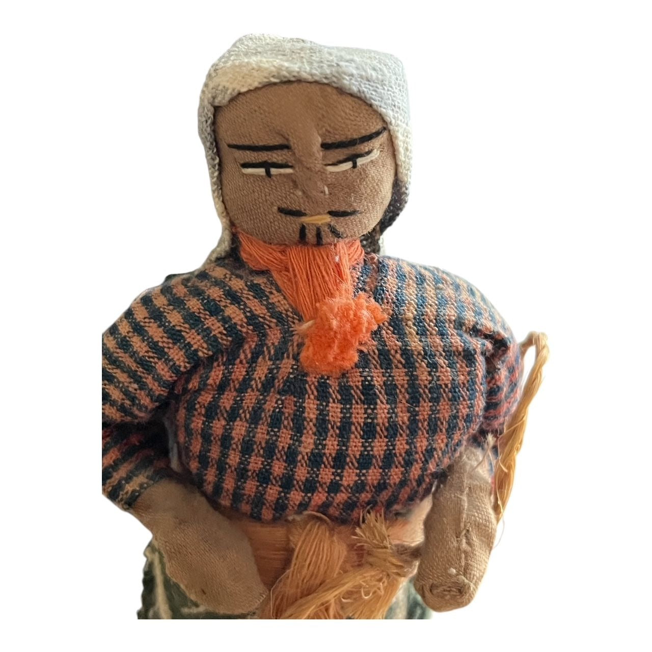 Pair of vintage handcrafted Guatemalan folk art dolls made with traditional woven textiles and hand-painted details. The woman carries a woven basket on her head along with a bundle of sticks, and the man carries a green ceramic-style bowl on his back. Each doll stands on a wooden base marked “GUATEMALA.” Beautiful artisan craftsmanship and vibrant traditional clothing make these great display pieces.