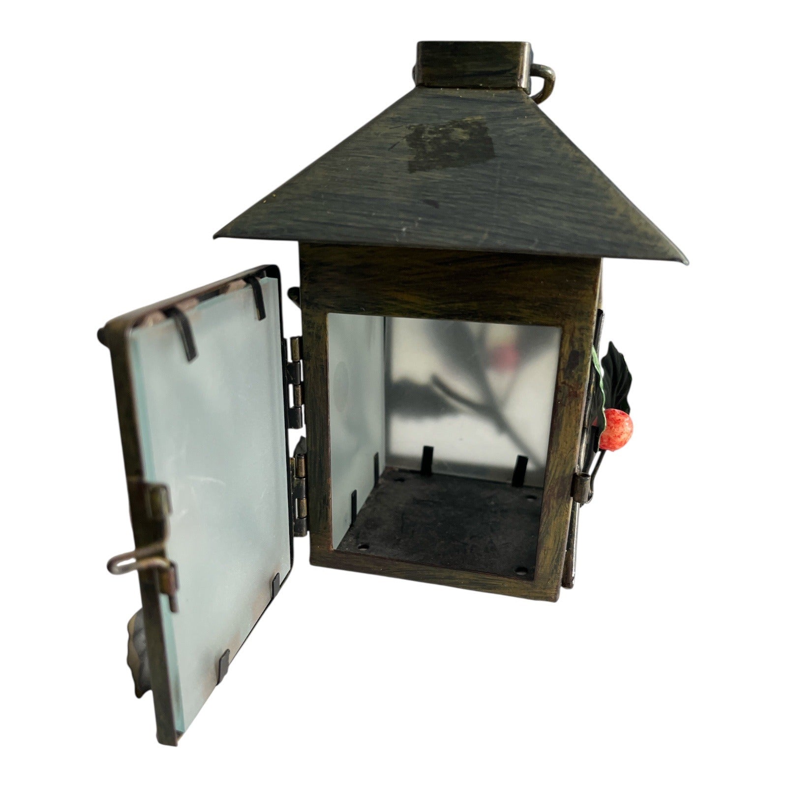Vintage Holiday Lantern with Holly & Berry Accents – Metal & Frosted Glass – 5.5 x 3 in – 1990s–2000s