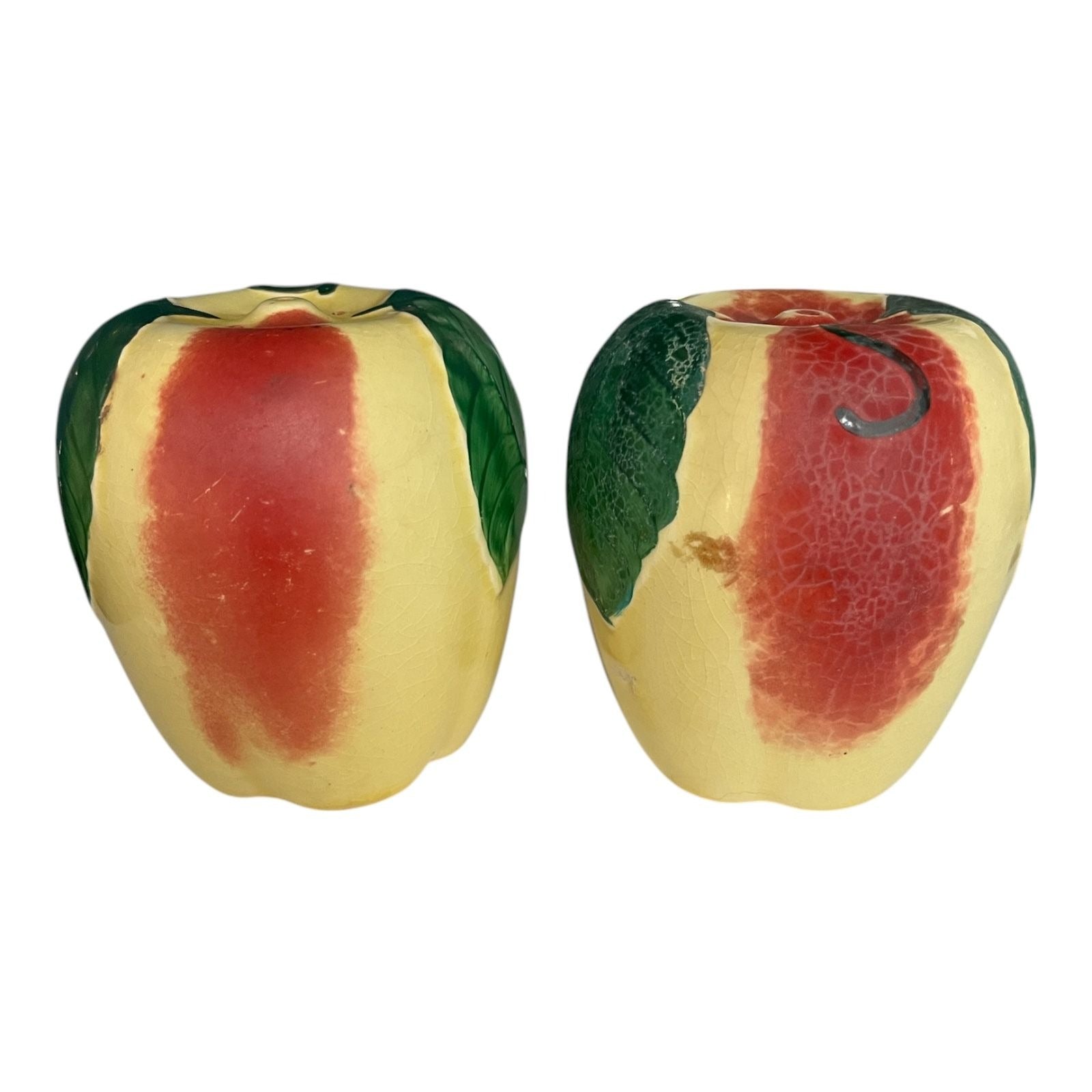 Vintage Hull Pottery Apple Salt and Pepper Shakers – Hand-Painted Red and Yellow Fruit Design with Green Leaves – 1950s