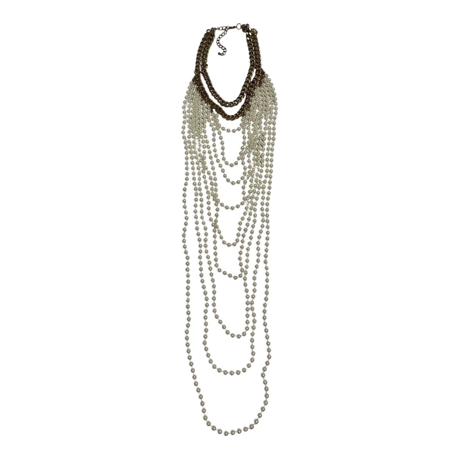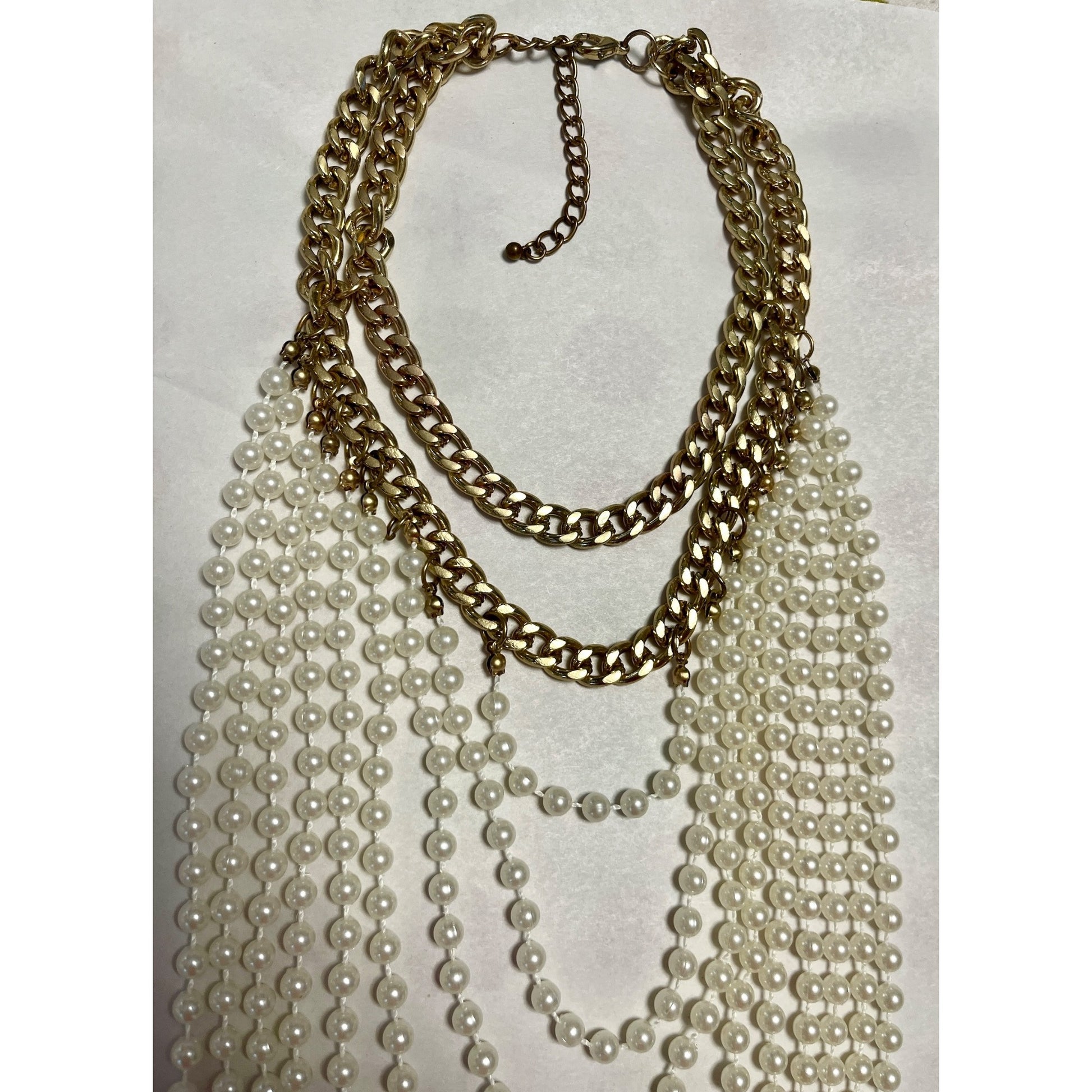 Dramatic and eye-catching, this multi-strand pearl statement necklace features cascading faux pearl beads layered from chunky gold-tone chains. With its glamorous draped design, it makes the perfect accessory for evening wear, special occasions, or elevating a simple outfit with bold flair.