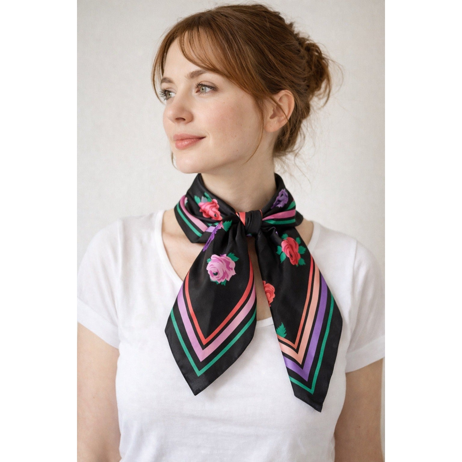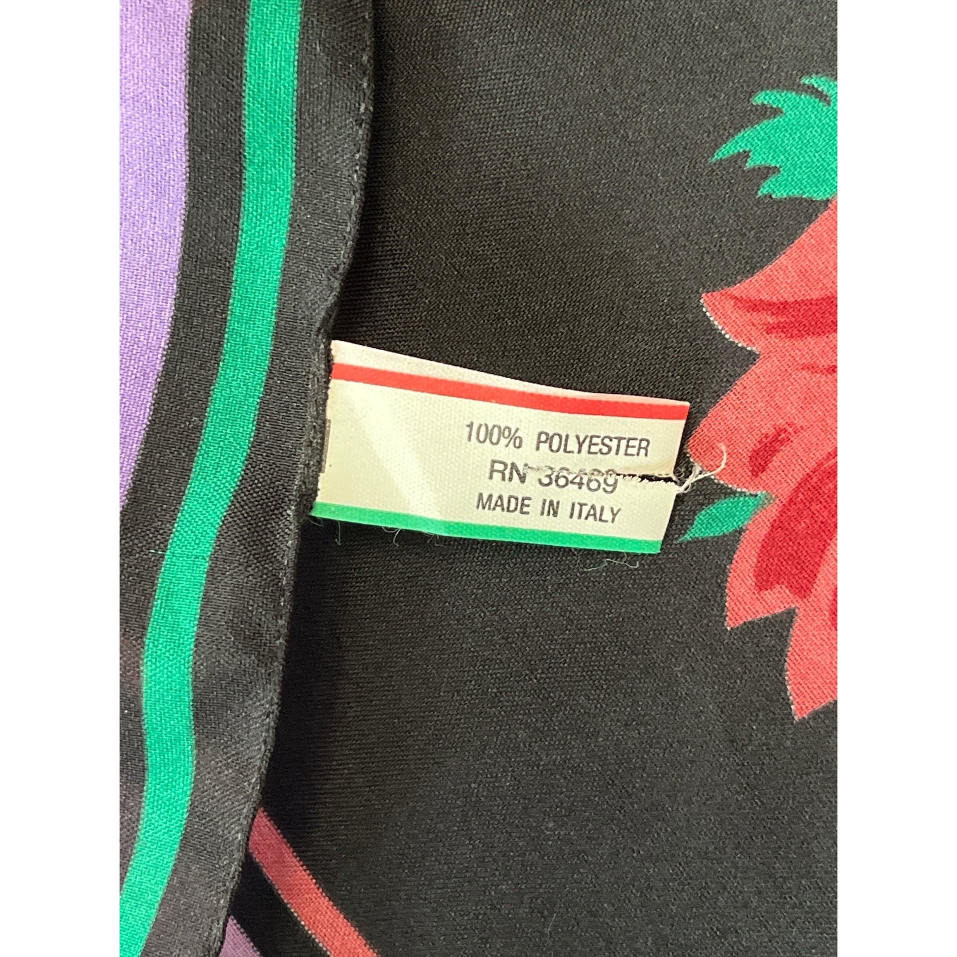 Vintage square scarf featuring a bold black background with scattered rose blooms in pink, red, and lavender, framed by a colorful striped border. Lightweight with a smooth drape, this Italian-made piece adds a classic retro accent whether worn as a neck scarf, hair wrap, bag accessory, or display textile.