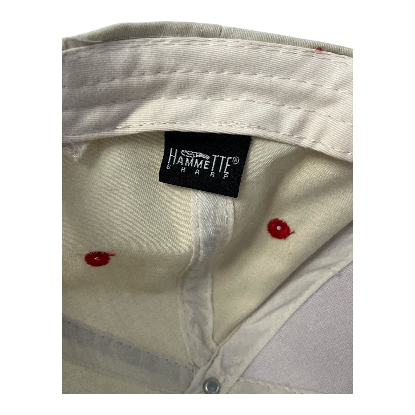 Show off retro attitude with this bold Kawasaki “Kicks Ass” cap by Hammette Sharp. This off-white baseball hat features an embroidered yellow dump truck graphic with red and black text, “Great Southern Equipment,” and a patriotic American flag patch on the side. Red eyelets and trim complete the classic 1990s–2000s industrial promo style.
