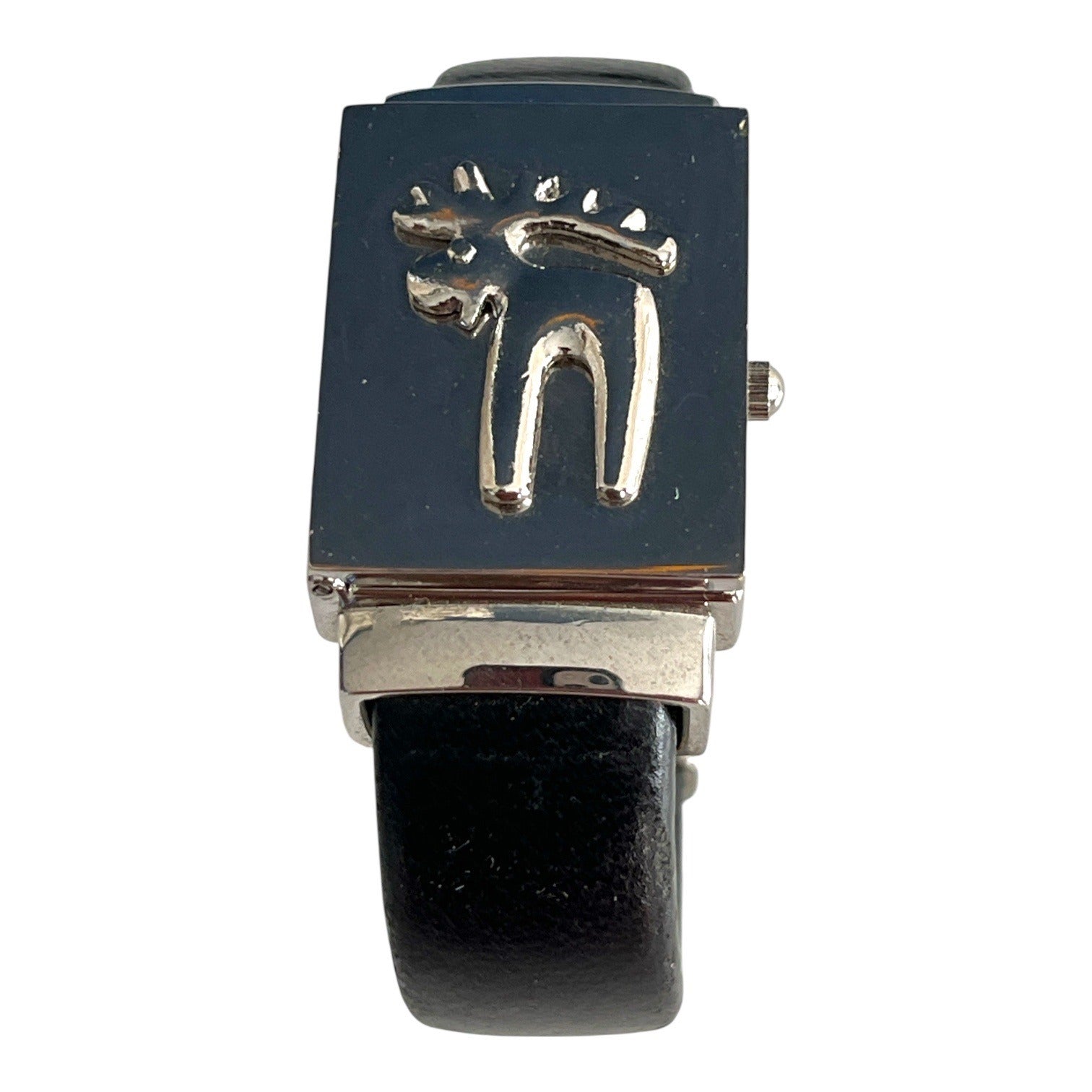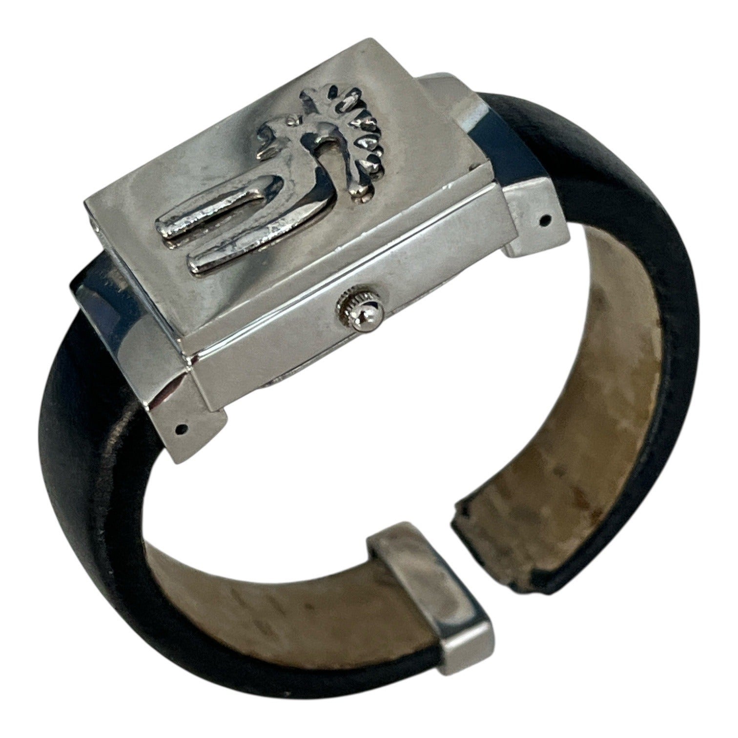 Vintage wide cuff wristwatch featuring a silver tone rectangular case with raised Kokopelli design on the cover. Hinged lid opens to reveal a white dial with stylized numerals and Japan quartz movement. Black leather wide cuff band gives it bold Southwestern artisan styling.
