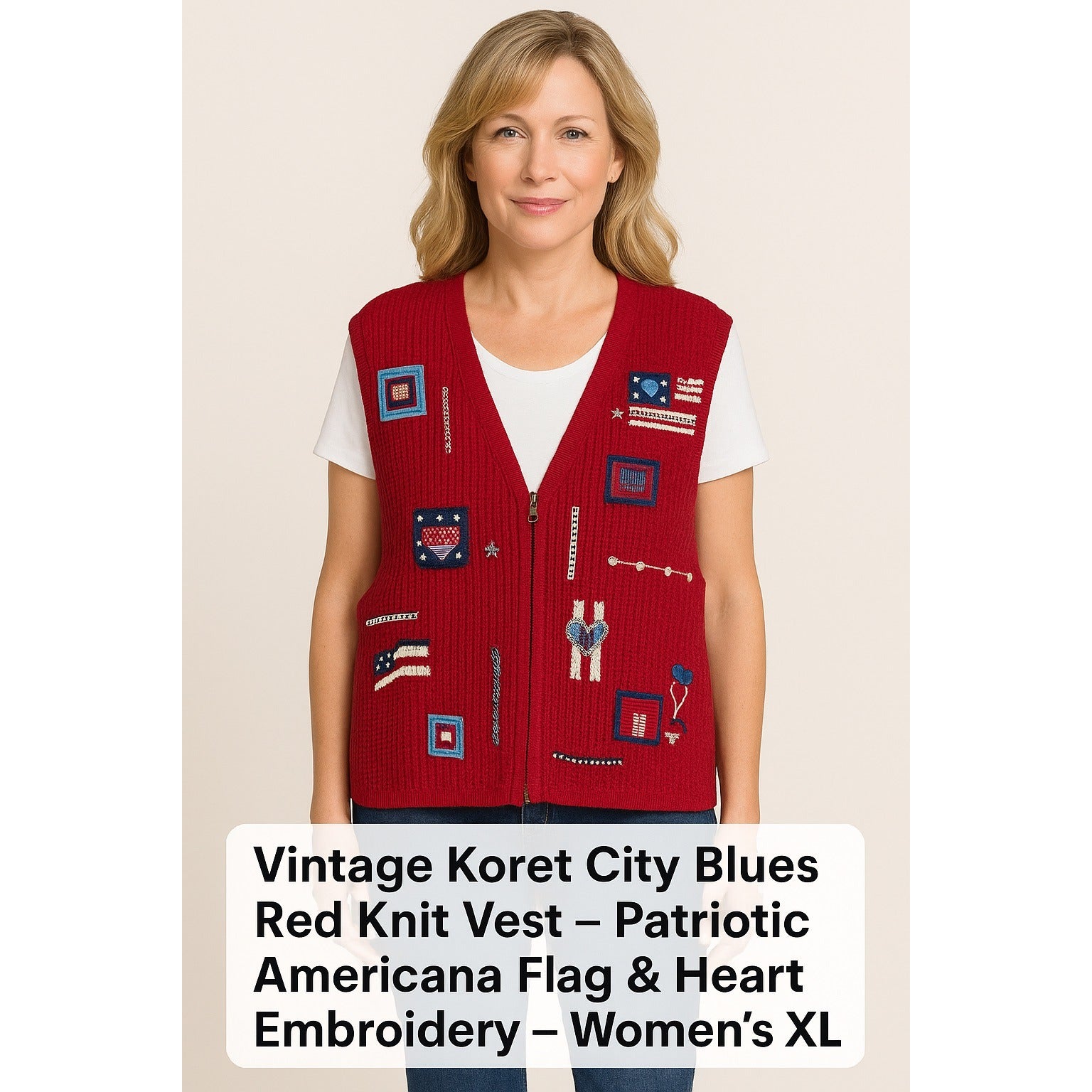 Vintage Koret City Blues Red Knit Vest – Patriotic Americana Flag & Heart Embroidery – Women’s XL