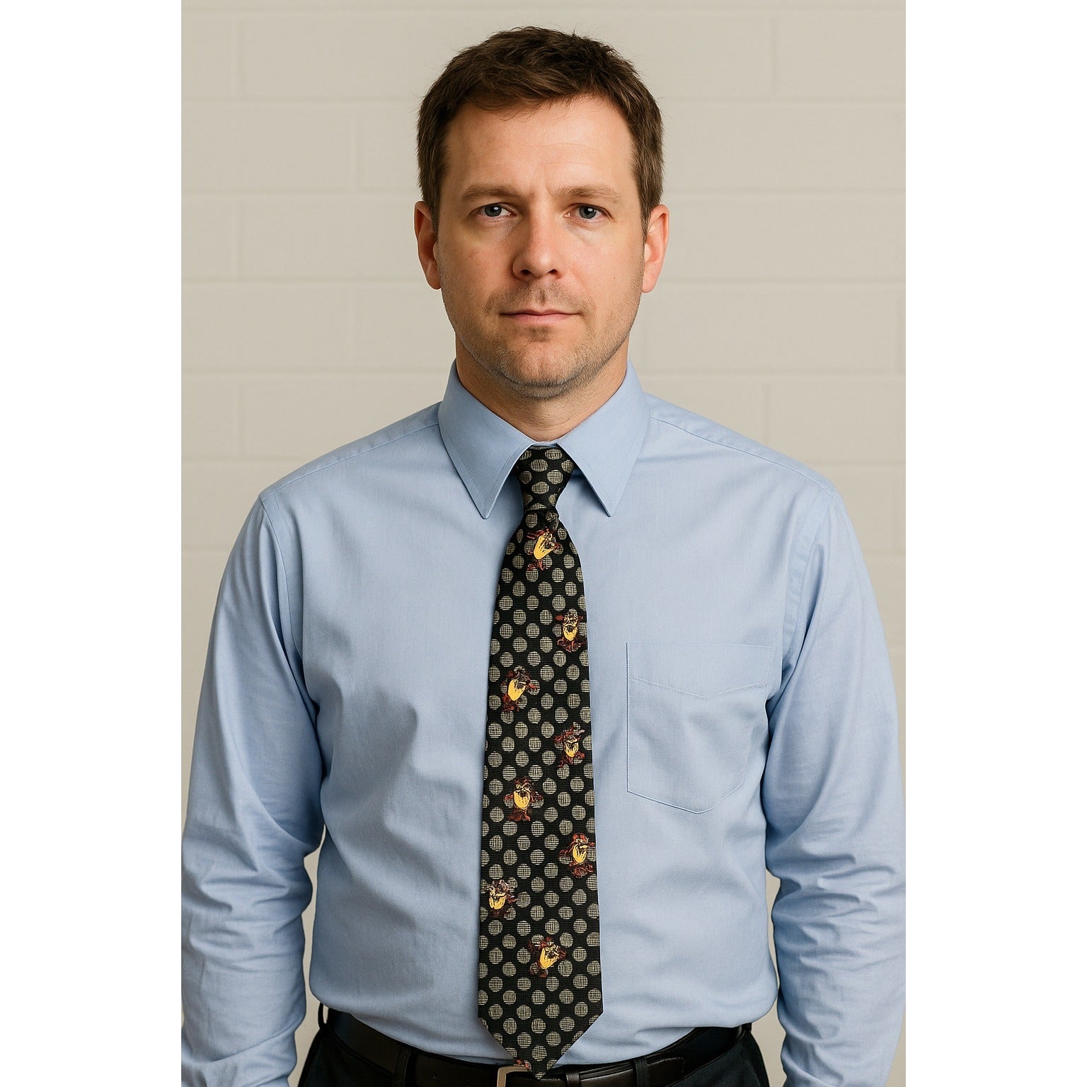 Fun and collectible men’s necktie featuring Taz the Tasmanian Devil from Looney Tunes. The black background is accented with a repeating gray geometric circle pattern and animated Taz character poses. Official Warner Bros licensed tie, made in Korea.