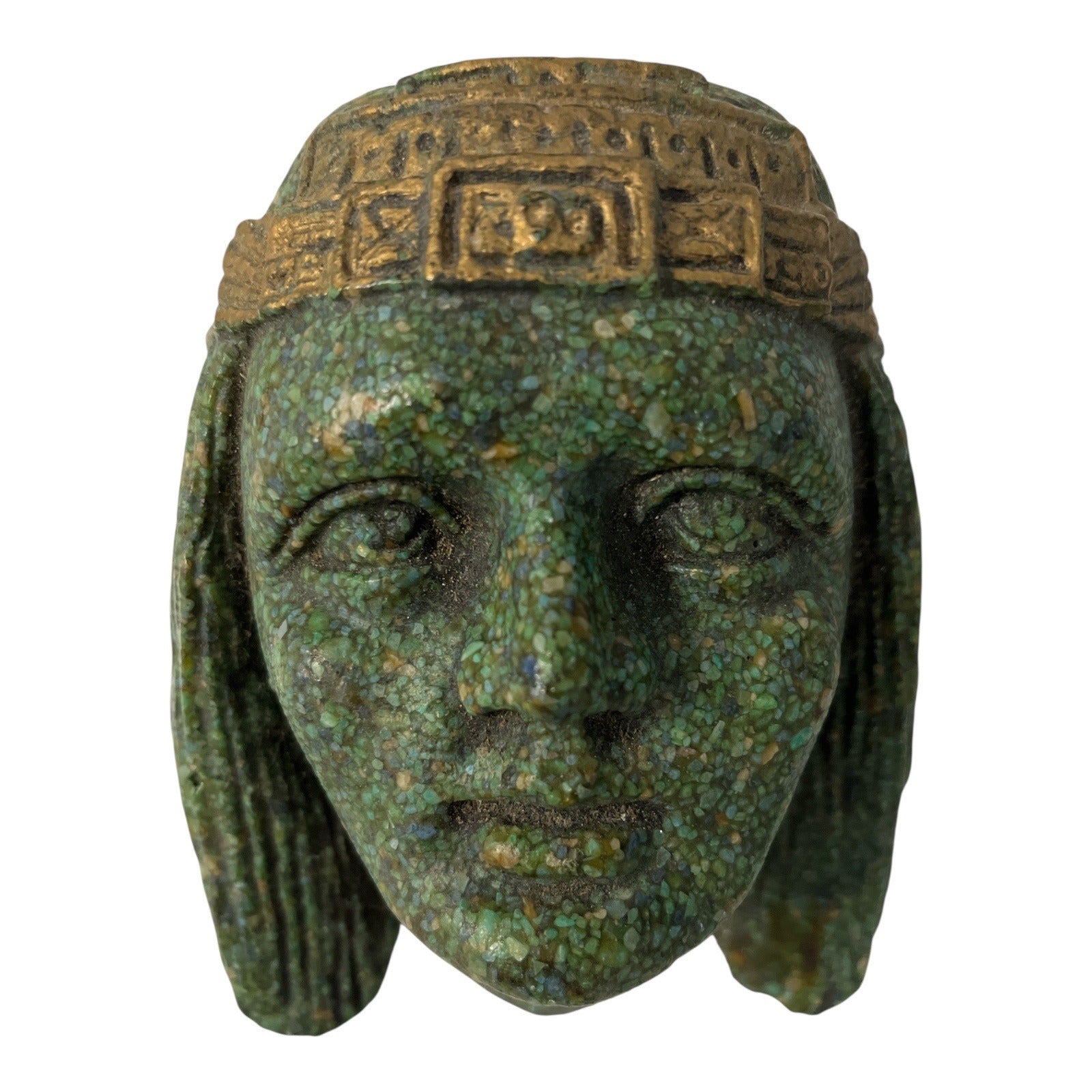 Vintage Mayan Aztec Revival Wall Plaque – Green Stone Composite Head Sculpture – 4.5” – 1 lb 5 oz.