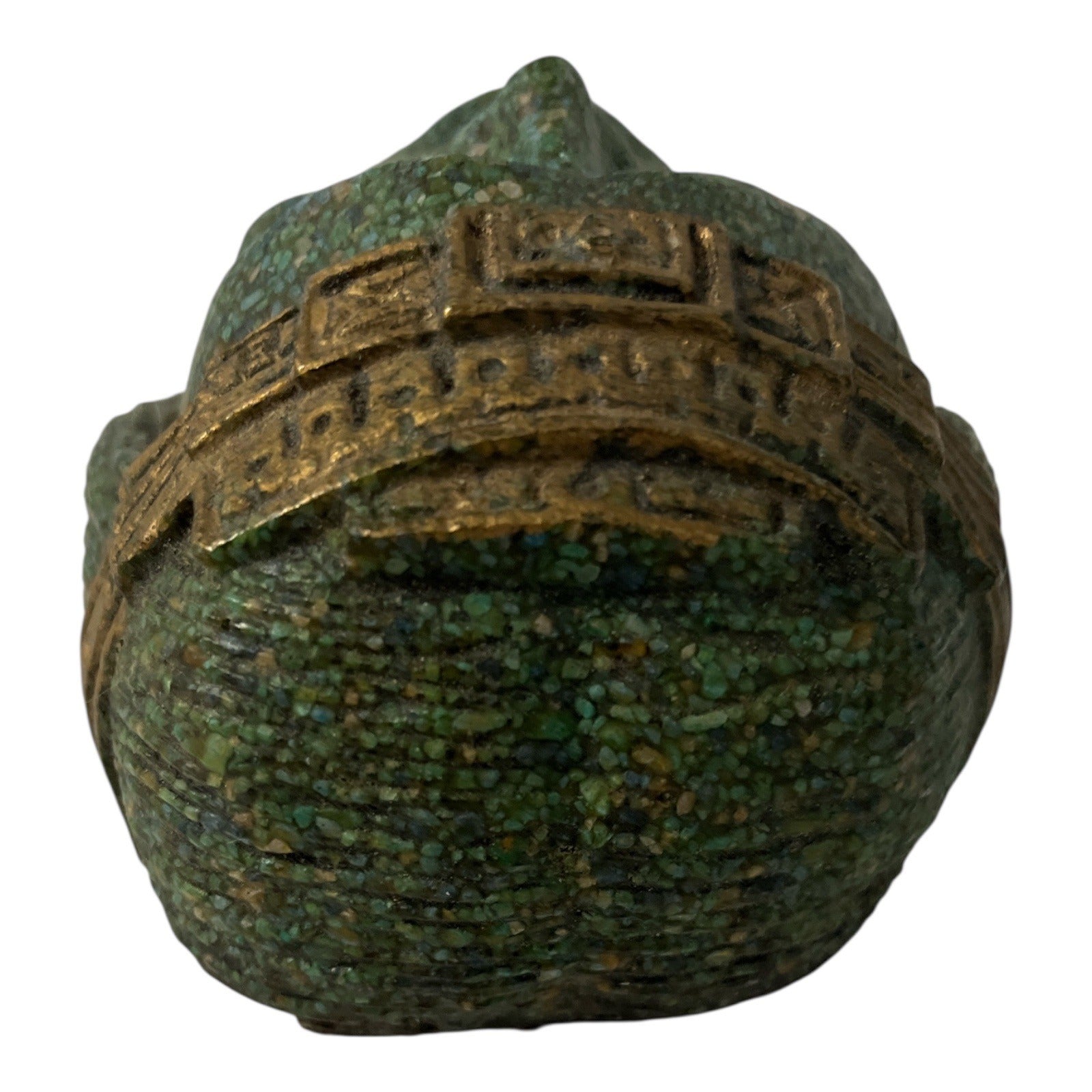 This vintage wall plaque depicts a stylized face inspired by Mayan and Aztec art, crafted in a dense green crushed-stone composite designed to resemble jade. The head is adorned with a geometric headdress highlighted in gold, echoing ancient Mesoamerican motifs.