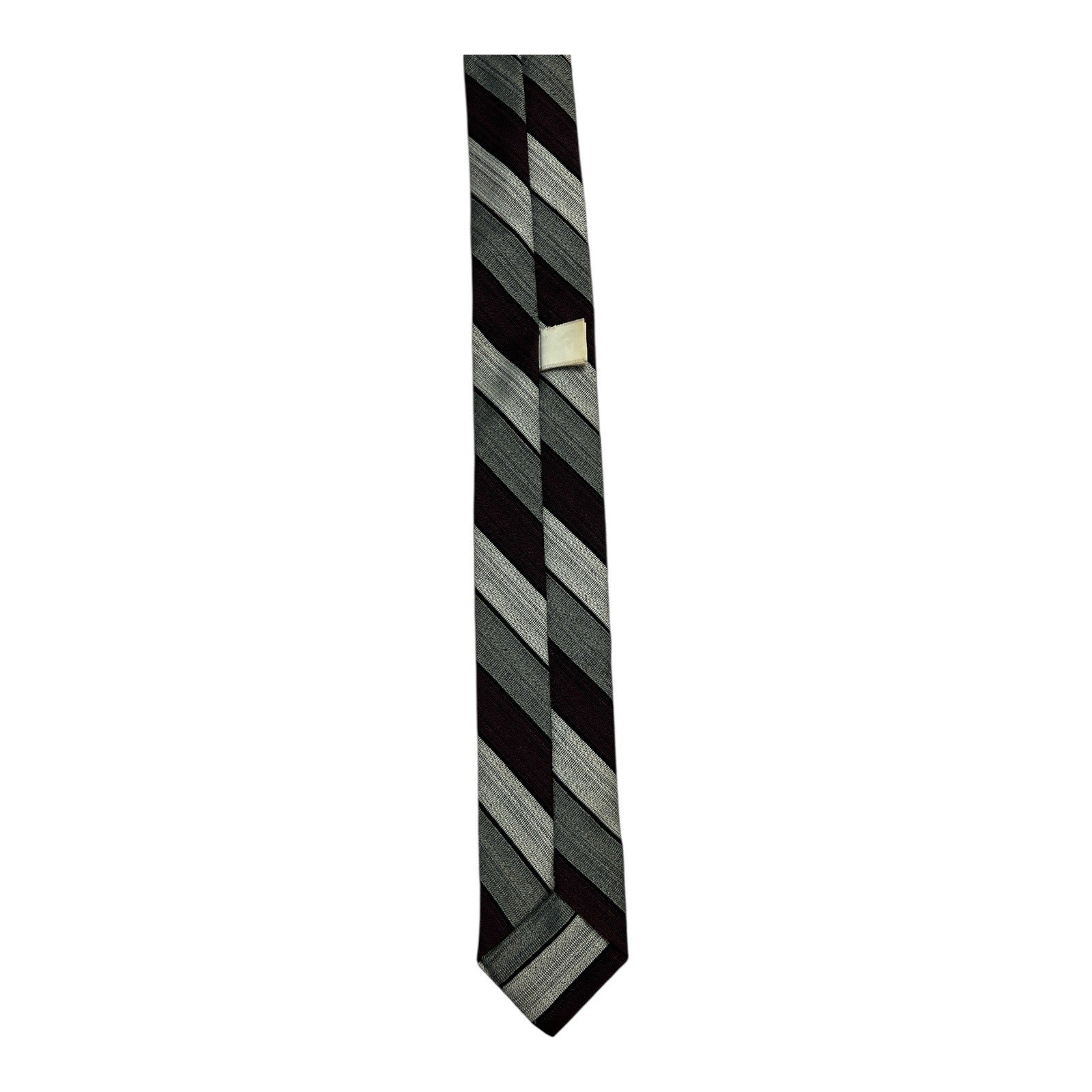 Classic vintage men’s tie featuring a sharp diagonal stripe pattern in shades of gray and burgundy. Made of 100% Dacron polyester, this mid-century design adds a refined touch to any outfit. Ideal for collectors, retro fashion lovers, or formal wear with timeless style.