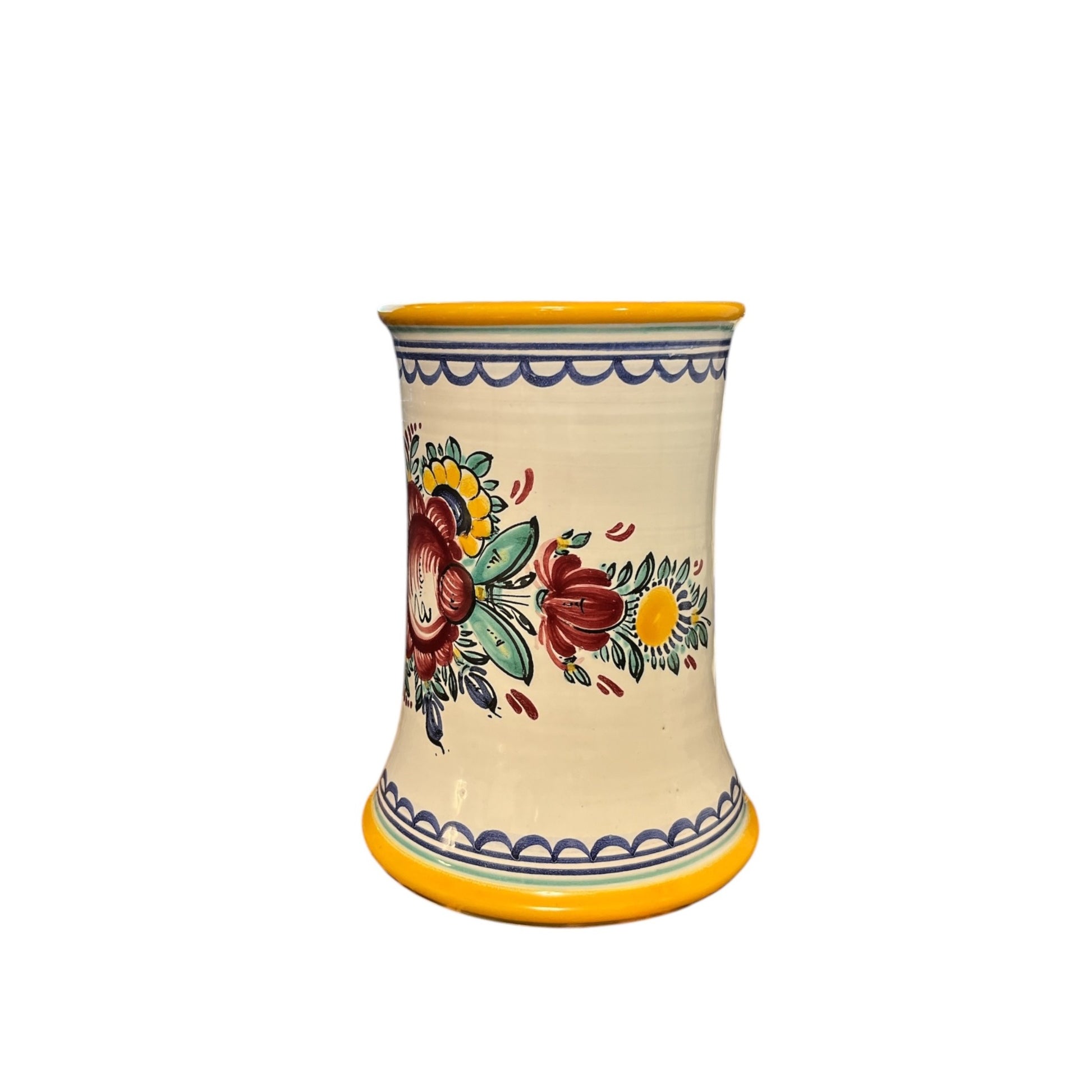 Vintage ceramic mug in the Modra majolica style, inspired by traditional Slovak folk pottery. This piece features a hand-painted floral design with bold red flowers, yellow accents, and blue and green foliage, along with decorative blue banding near the rim and base. Finished with a bright yellow rim and base and a rounded handle with painted detail.