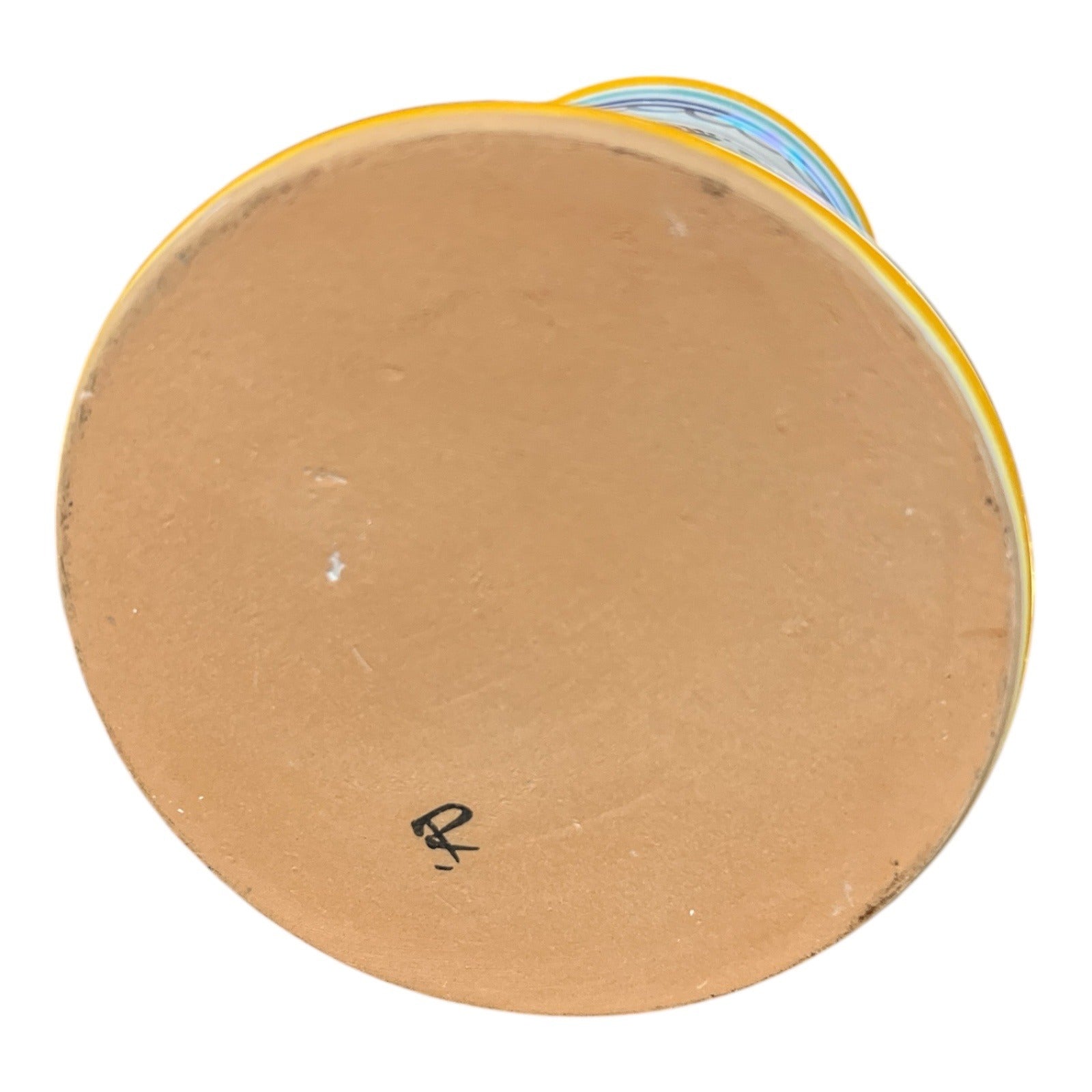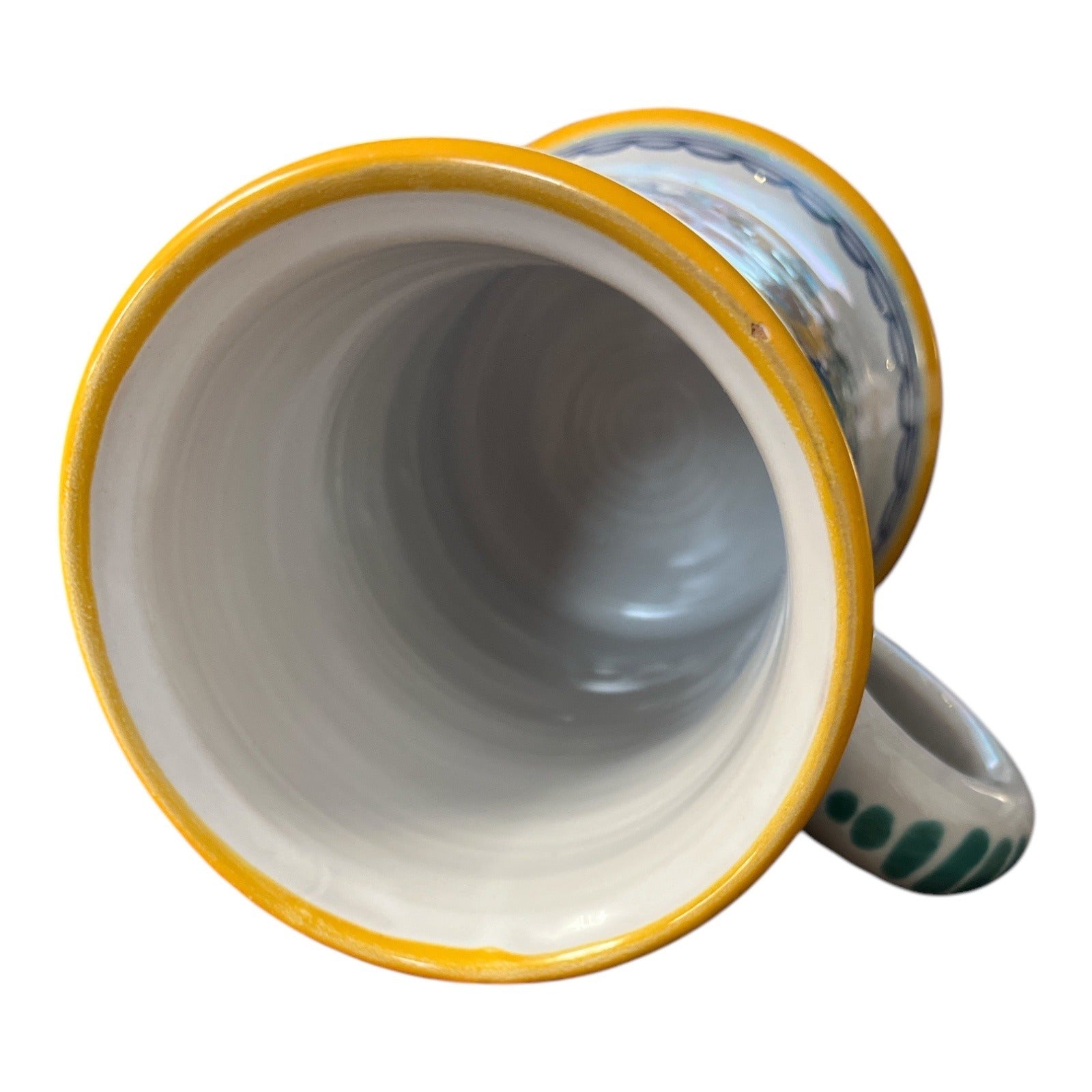 The mug has a gently flared shape and visible brushwork, giving it a handmade, artisan appearance. The underside bears a hand-painted initial, likely the decorator’s mark rather than a factory stamp. No country or maker stamp is present.