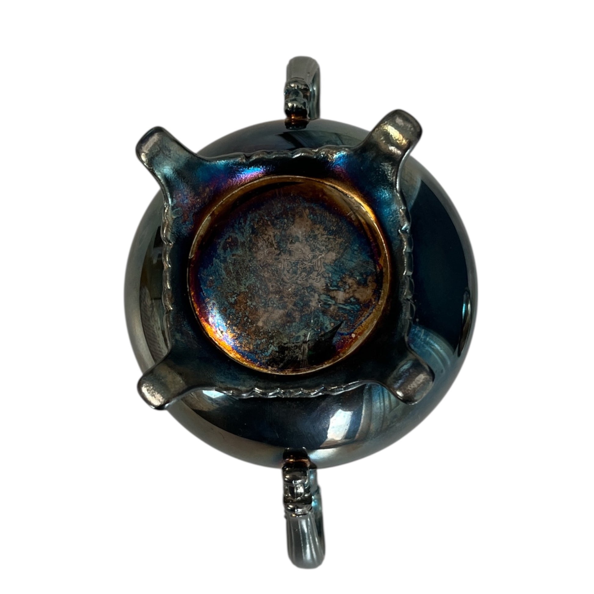 This vintage mid-century Oneida USA silverplate sugar bowl brings timeless elegance to your table or collection. Crafted between the 1950s–1970s, it features ornate handles, a fitted lid with decorative finial, and a classic footed base that highlights Oneida’s renowned craftsmanship.
