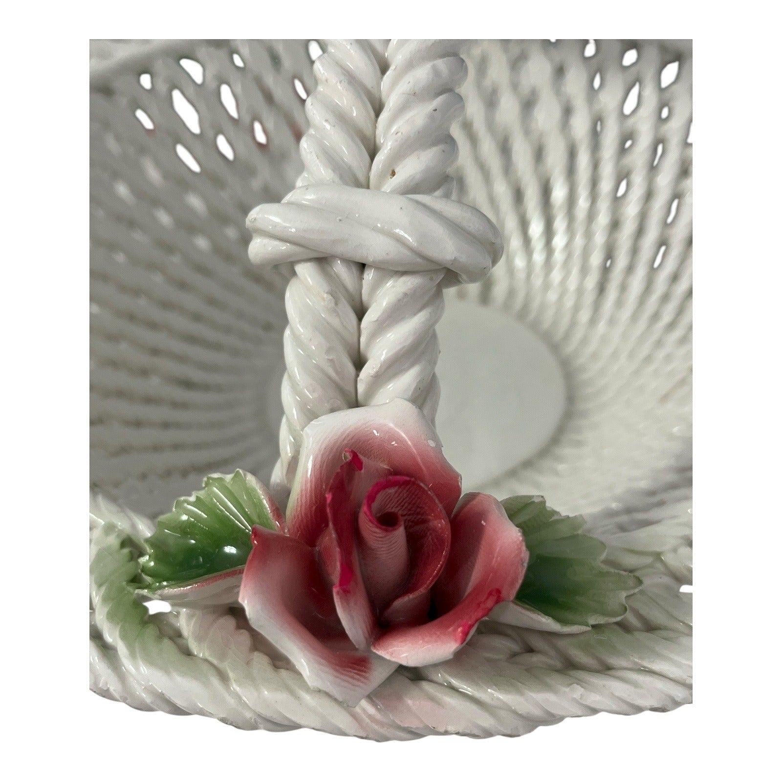Vintage Porcelain Rope Basket with Pink Roses – White Lattice Handle Floral Centerpiece – 11”