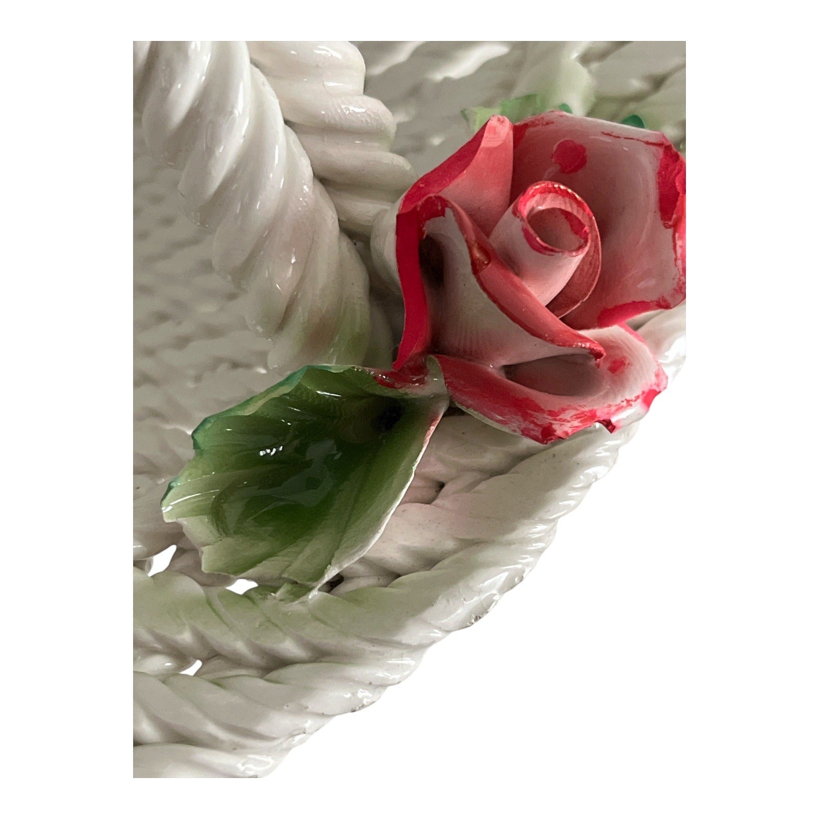 Charming vintage porcelain basket featuring a twisted rope-style lattice design adorned with hand-applied pink roses and green leaves. The glossy white glaze and delicate detailing make this a beautiful decorative accent for cottage, shabby chic, or romantic home décor.