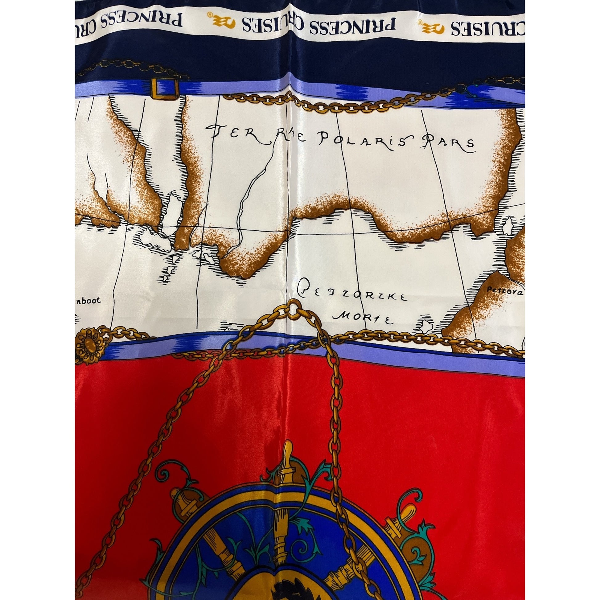 Vibrant vintage Princess Cruises scarf featuring a detailed Old World nautical map design with anchors, compass roses, sailing ships, chains, and heraldic crests. Rich colors—navy, red, gold, teal—create a striking maritime look perfect for collectors or cruise memorabilia enthusiasts. Soft silk-feel fabric, ideal for wearing, displaying, or framing.