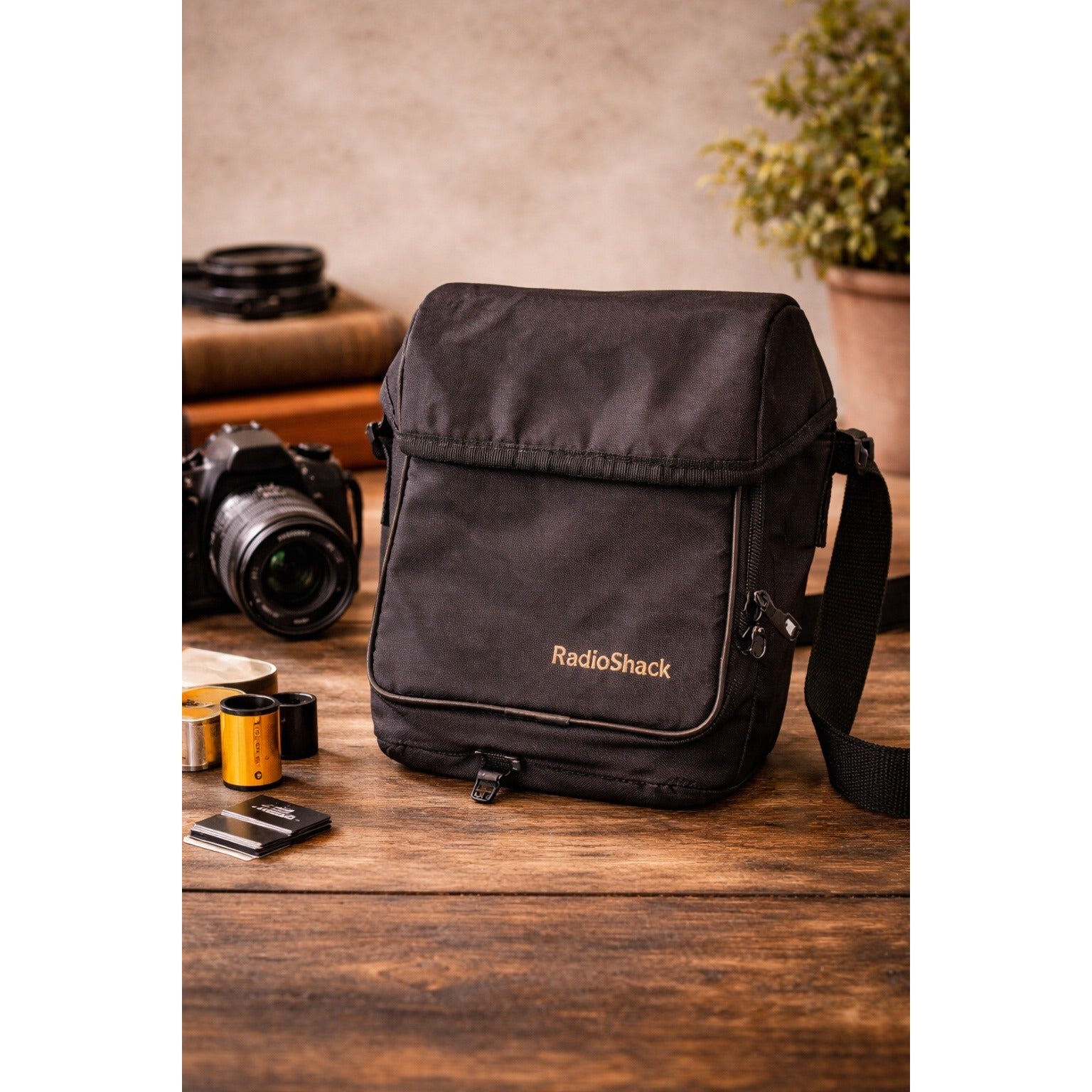 Compact vintage RadioShack camera bag featuring a structured padded interior with adjustable dividers designed to protect a camera and accessories. Includes multiple zip compartments for organized storage plus a zippered bottom pass-through opening that allows a cord or cable to run from inside the bag to the outside. Lightweight, practical, and durable with a classic utilitarian look, ideal for photography gear, electronics, or everyday carry.