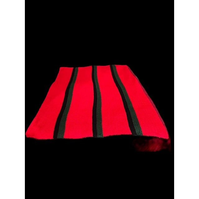 Beautiful handmade crochet afghan featuring bold red with alternating green and black stripes. Perfect for adding a pop of color to your living room, bedroom, or for cozying up on chilly evenings.