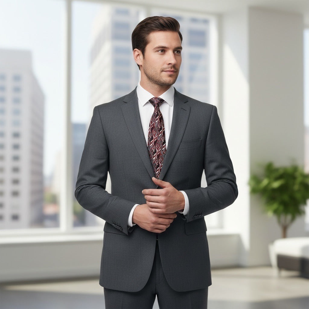 Vintage silk necktie by Screenplay, designed by Martin Wong. Features a bold abstract swirl and geometric pattern in deep red, black, gray, and taupe tones. Made in the USA using imported silk fabric, with a classic wide blade silhouette typical of late 1980s–1990s design.