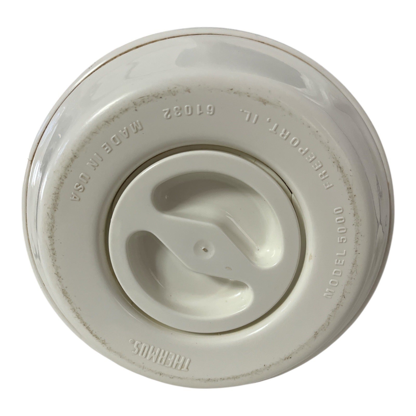 Vintage white insulated coffee carafe by Thermos, featuring a classic tall profile with integrated handle and pour spout. Designed to keep beverages hot or cold, this piece includes its original screw-top lid with push-button pour mechanism. Marked Made in USA on the base, model 5000. A clean, minimalist mid-century style that works well for everyday use, retro kitchens, or vintage Thermos collectors.