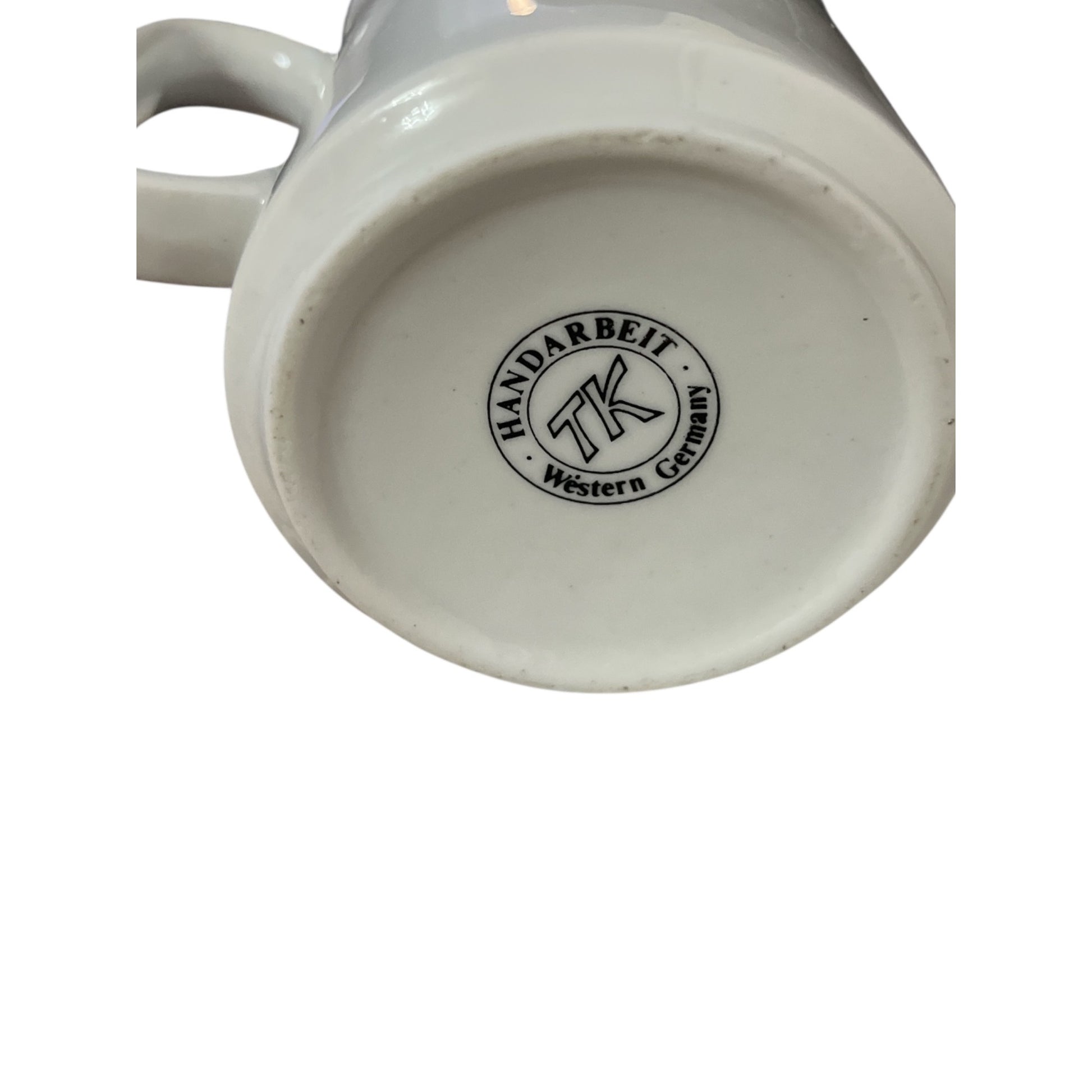 This vintage TK Handarbeit porcelain mug from Western Germany features the German sentiment “Der lieben Mutter” (“To Dear Mother”) framed by pink and blue roses with delicate greenery. Crafted in fine porcelain with a glossy glaze, it’s a charming collectible and a thoughtful gift for vintage kitchenware or German porcelain enthusiasts.