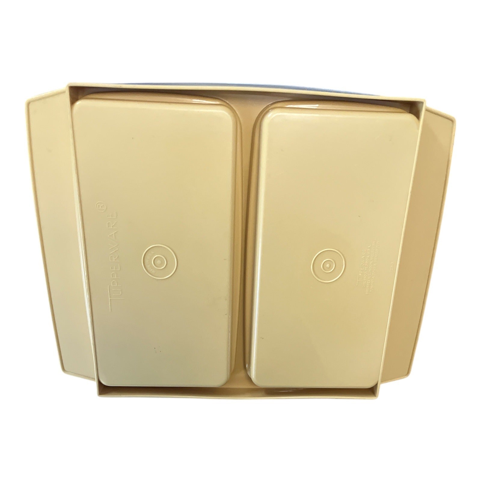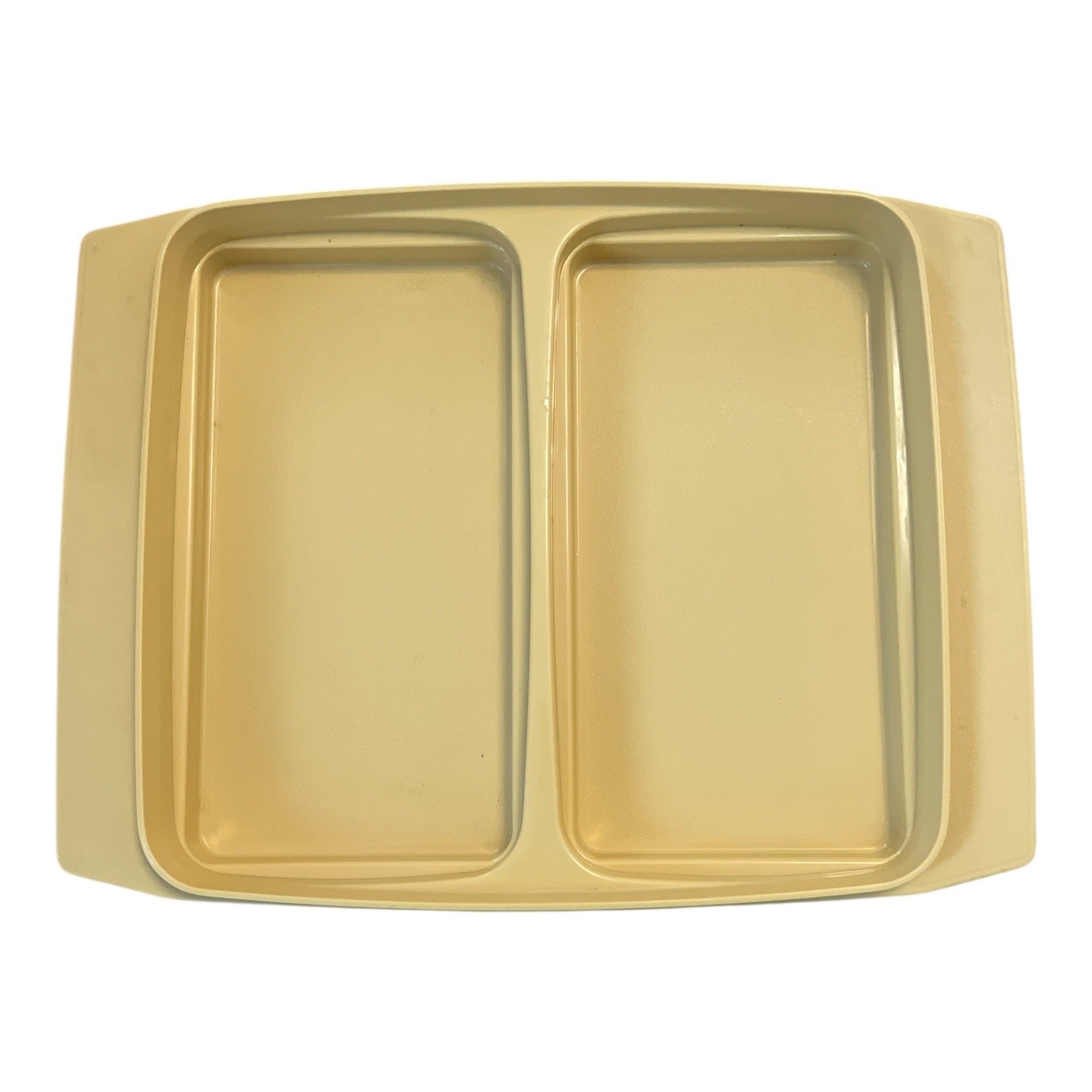 This listing is for the **base only** of a vintage Tupperware deviled egg carrier, model 723-3. Made in classic harvest gold, this rectangular base originally held two removable egg trays and a lid. Ideal as a replacement piece or for repurposed food storage.