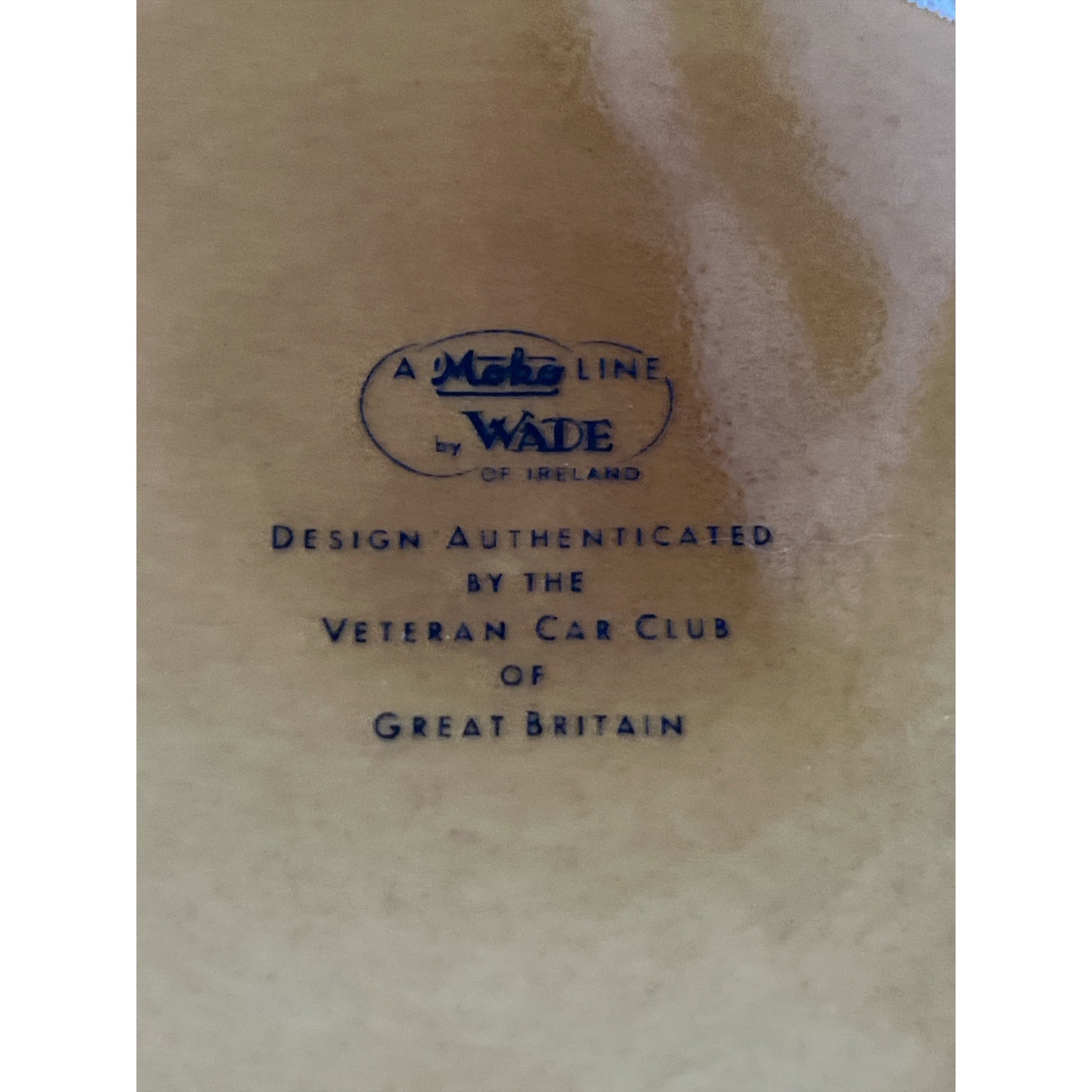Vintage ceramic mug produced by Wade of Ireland as part of the Veteran Cars series, featuring the 1903 White Steam Car limousine. The front shows a detailed illustration of the early automobile, while the reverse provides historical specifications including engine type and horsepower. The base is marked “A Moko Line by Wade of Ireland” and notes the design authentication by the Veteran Car Club of Great Britain. Finished in a warm brown glaze with classic tankard-style shaping and sculpted handle. A great collectible for automotive history enthusiasts or vintage mug collectors.
