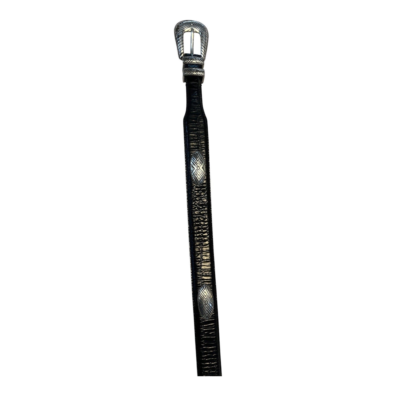 Vintage Western-Style Genuine Leather Belt with Tooled Silver-Tone Buckle & Accents – Black Croc Embossed – Size 35 x 1.13” – 1990s–2000s
