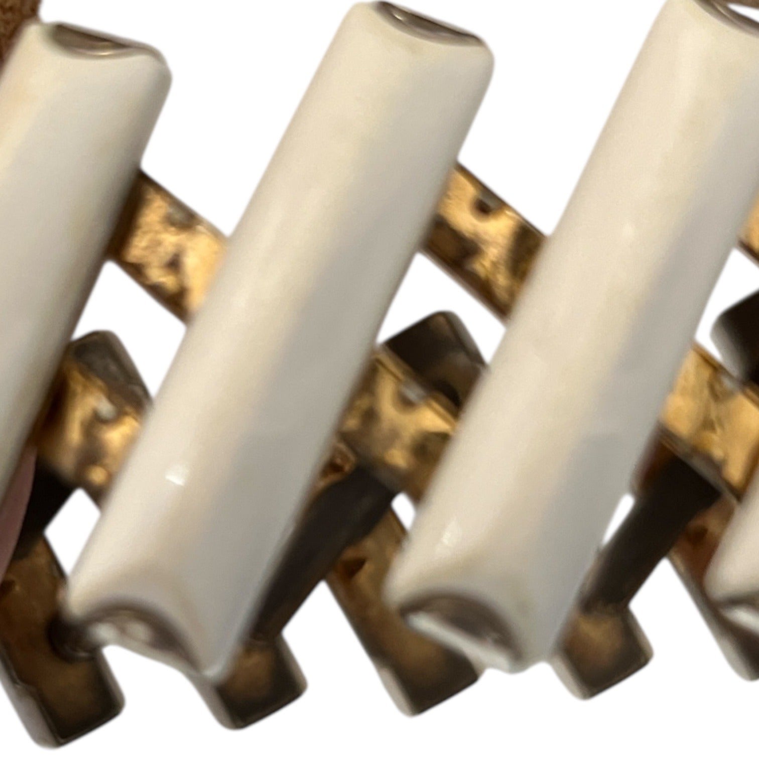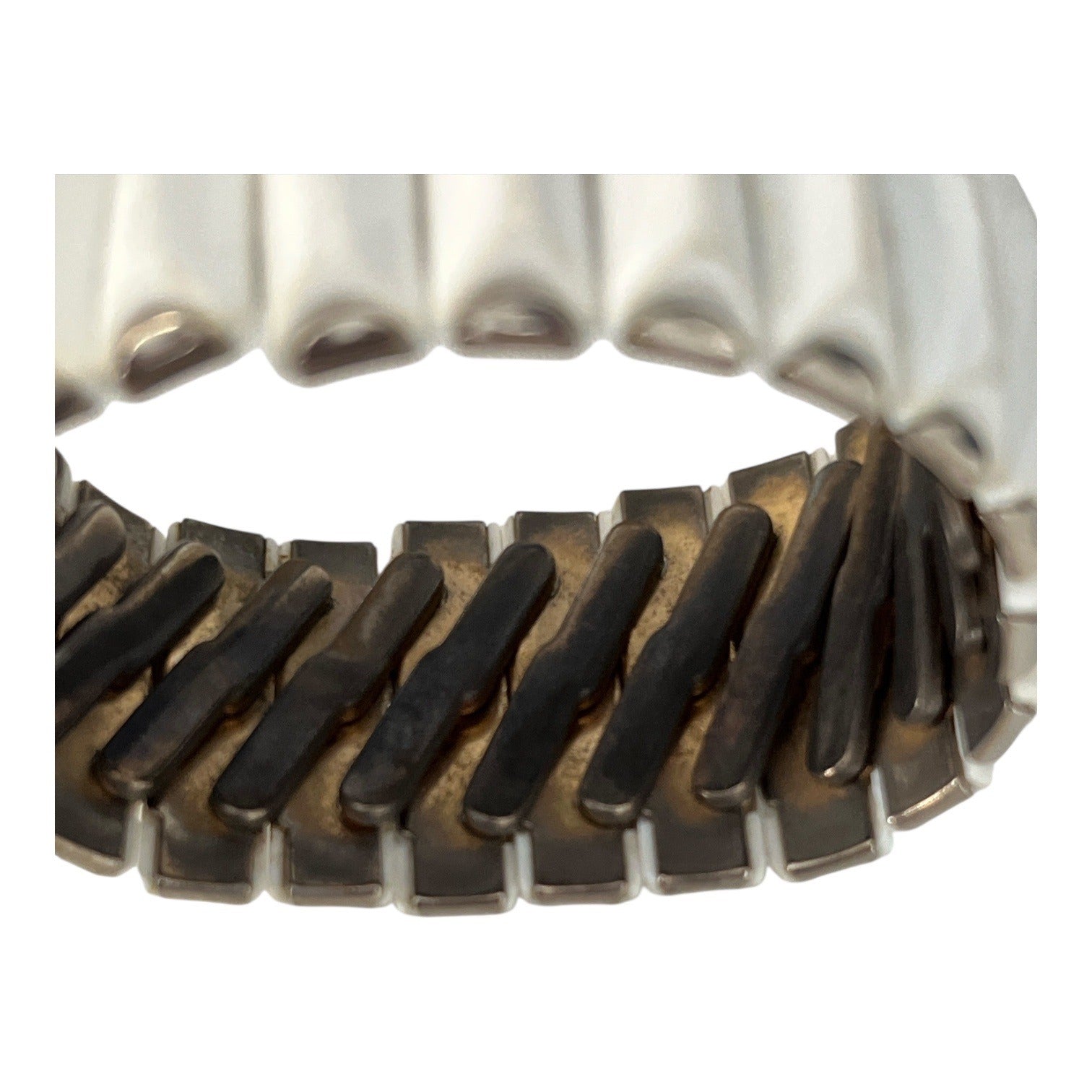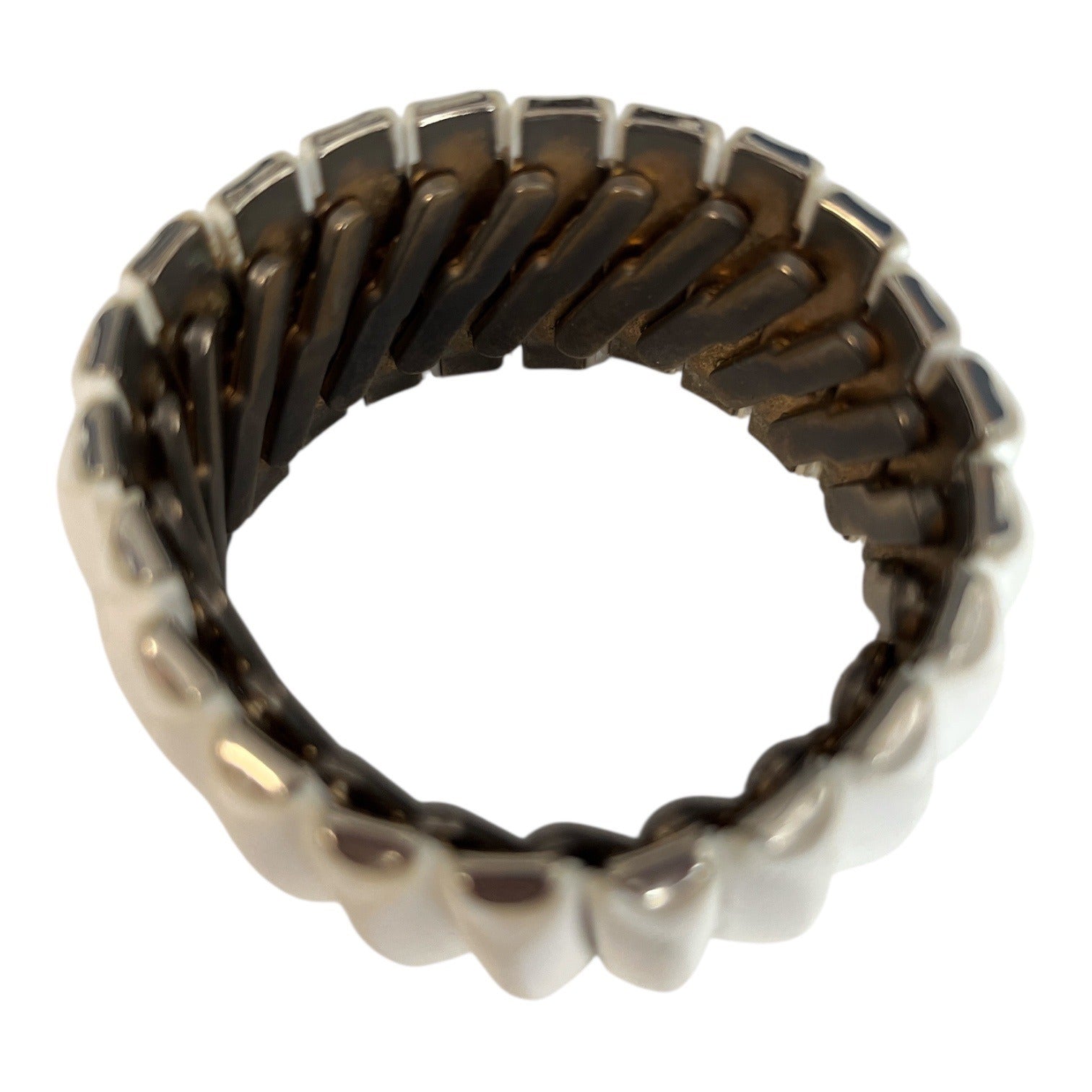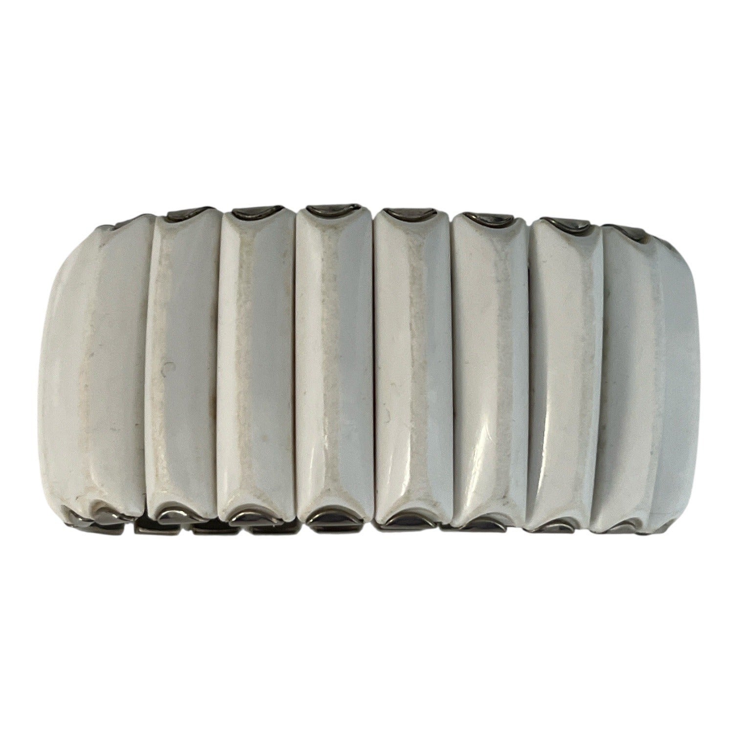 Vintage stretch bracelet featuring glossy white enamel links with silver-tone metal accents. The bracelet has a sculptural, segmented design with a smooth enamel finish and flexible stretch construction for easy wear. Classic statement style that works well with both vintage and modern outfits.
