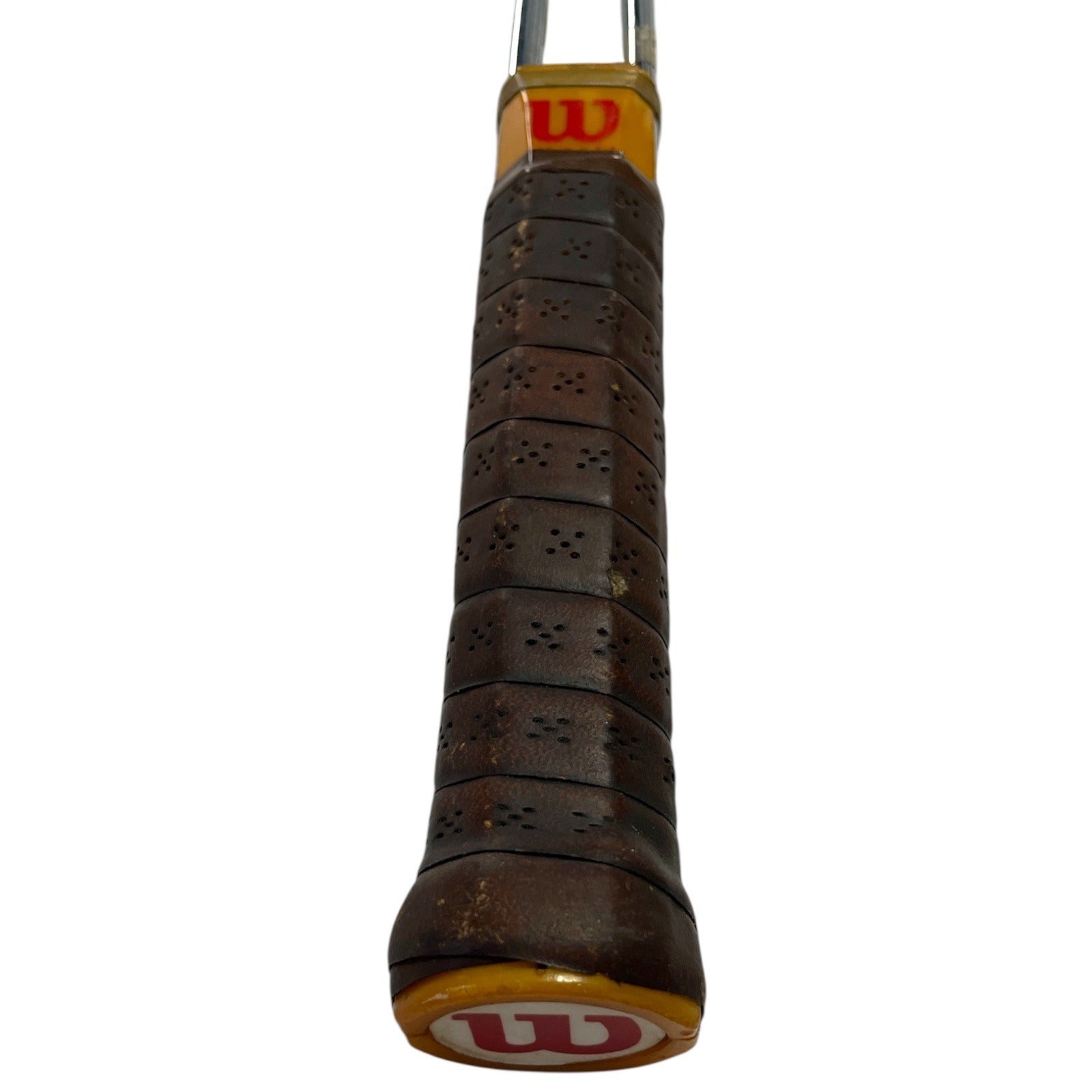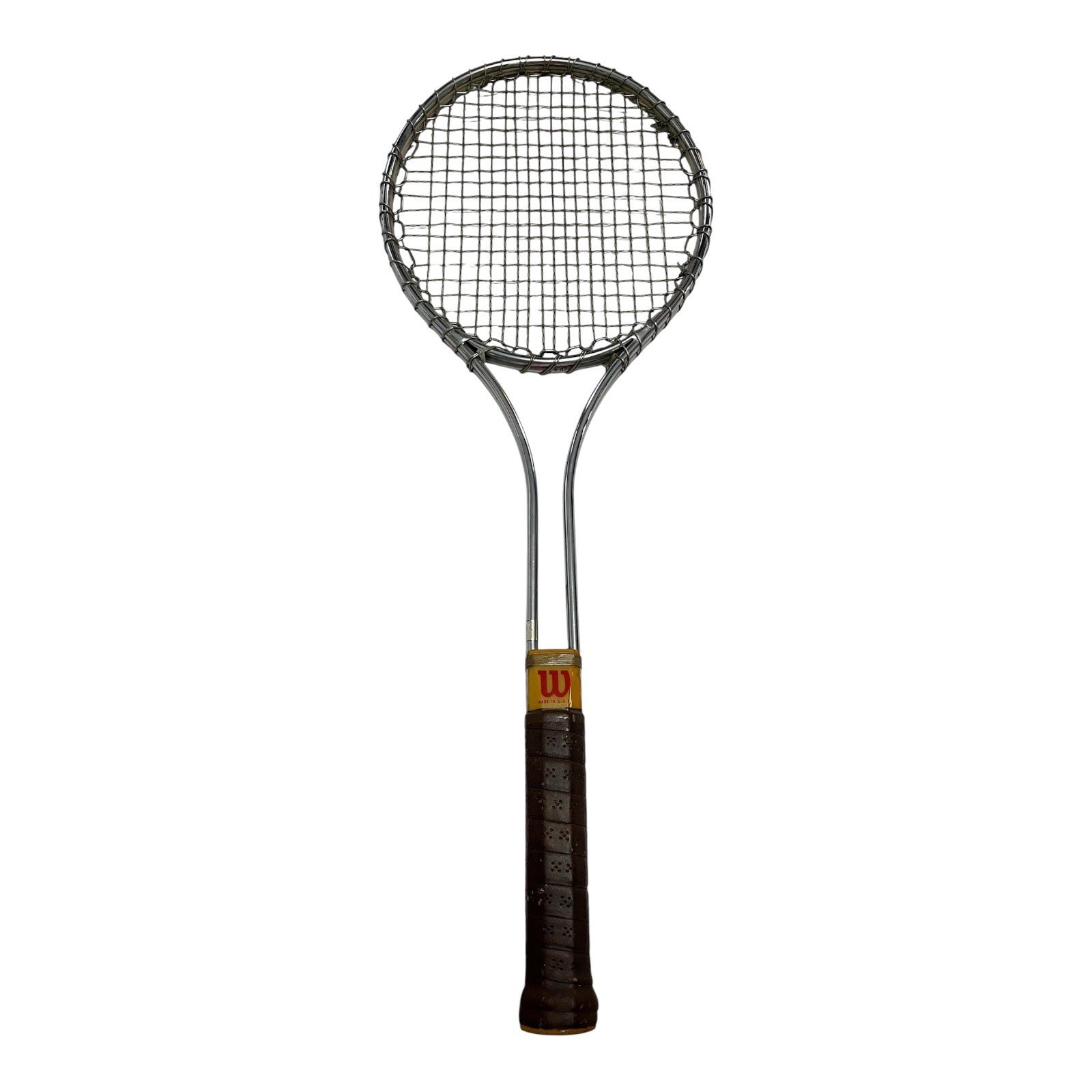 Step back into tennis history with this iconic Wilson T2000 steel tennis racket, famously used by Jimmy Connors. Known for its revolutionary chrome-plated steel frame and wire-wrap stringing system, the T2000 changed the game in the 1960s and 70s. This piece includes the original "Wilson T2000" zippered vinyl racket cover.