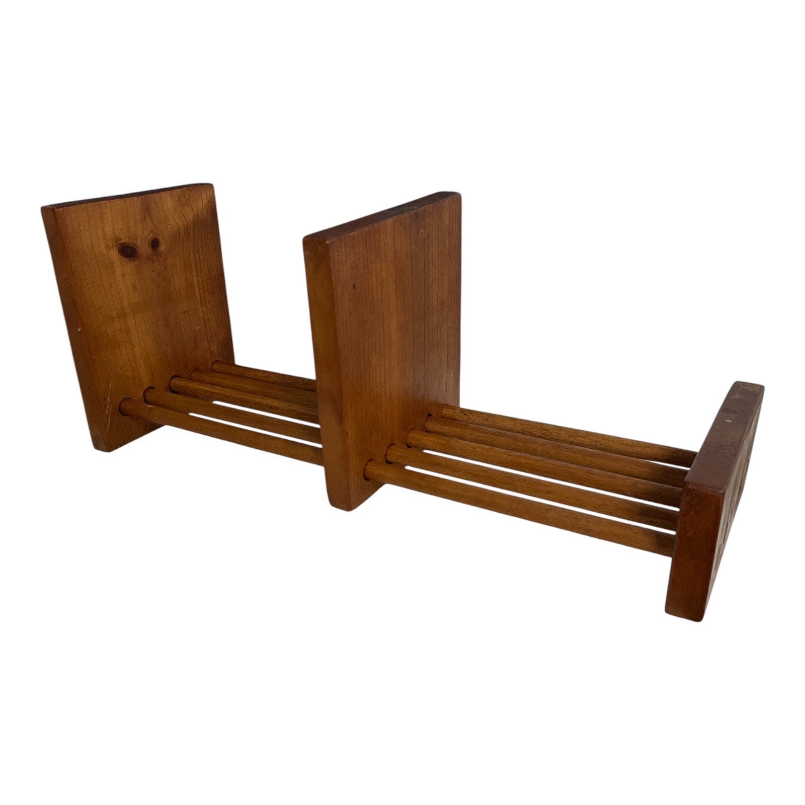 This vintage freestanding wooden rack features a simple, rustic design perfect for tabletop or counter use. Crafted with four dowel rods and a center divider, it’s versatile enough to hold books, files, records, magazines, or even kitchen linens. Its natural wood finish and handcrafted look add a touch of farmhouse or cottage charm to any space.