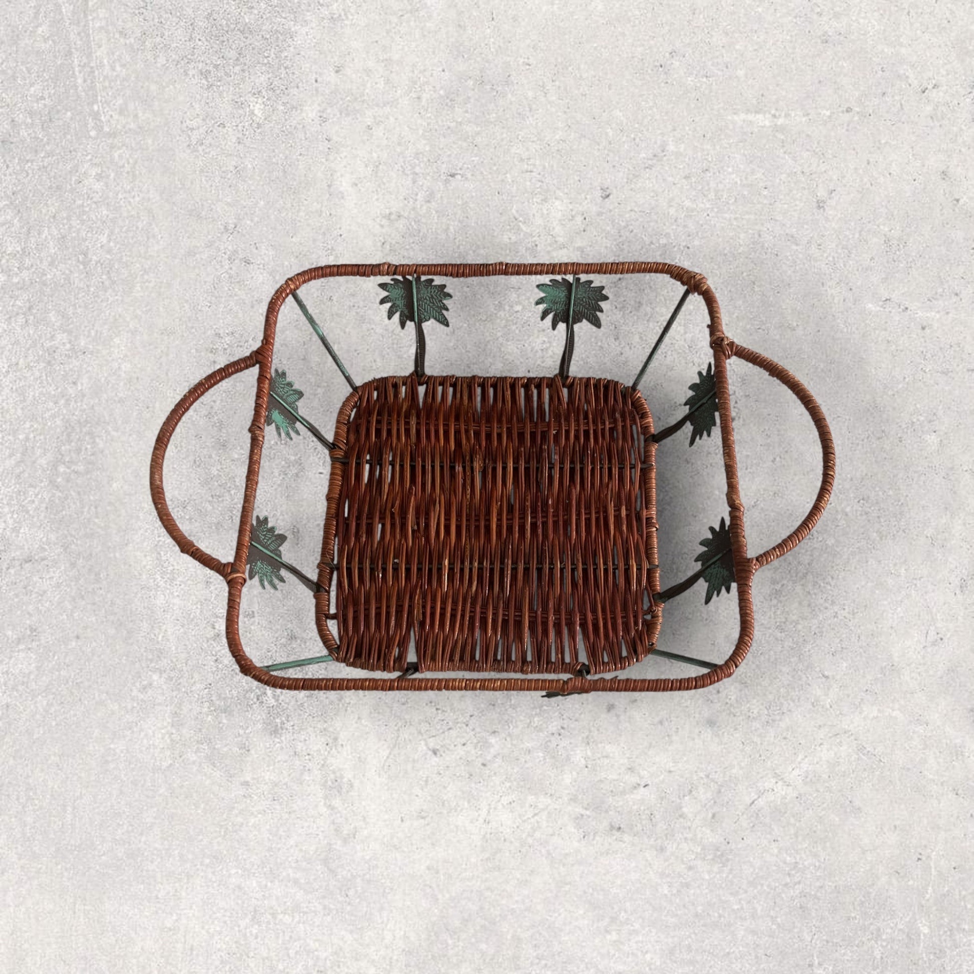 This charming vintage basket tray features a woven rattan base with decorative metal leaf accents along the sides. The rectangular shape and sturdy dual handles make it both functional and stylish—perfect for serving, display, or as a centerpiece. Its natural woven texture pairs beautifully with the rustic green patina of the metal leaves.