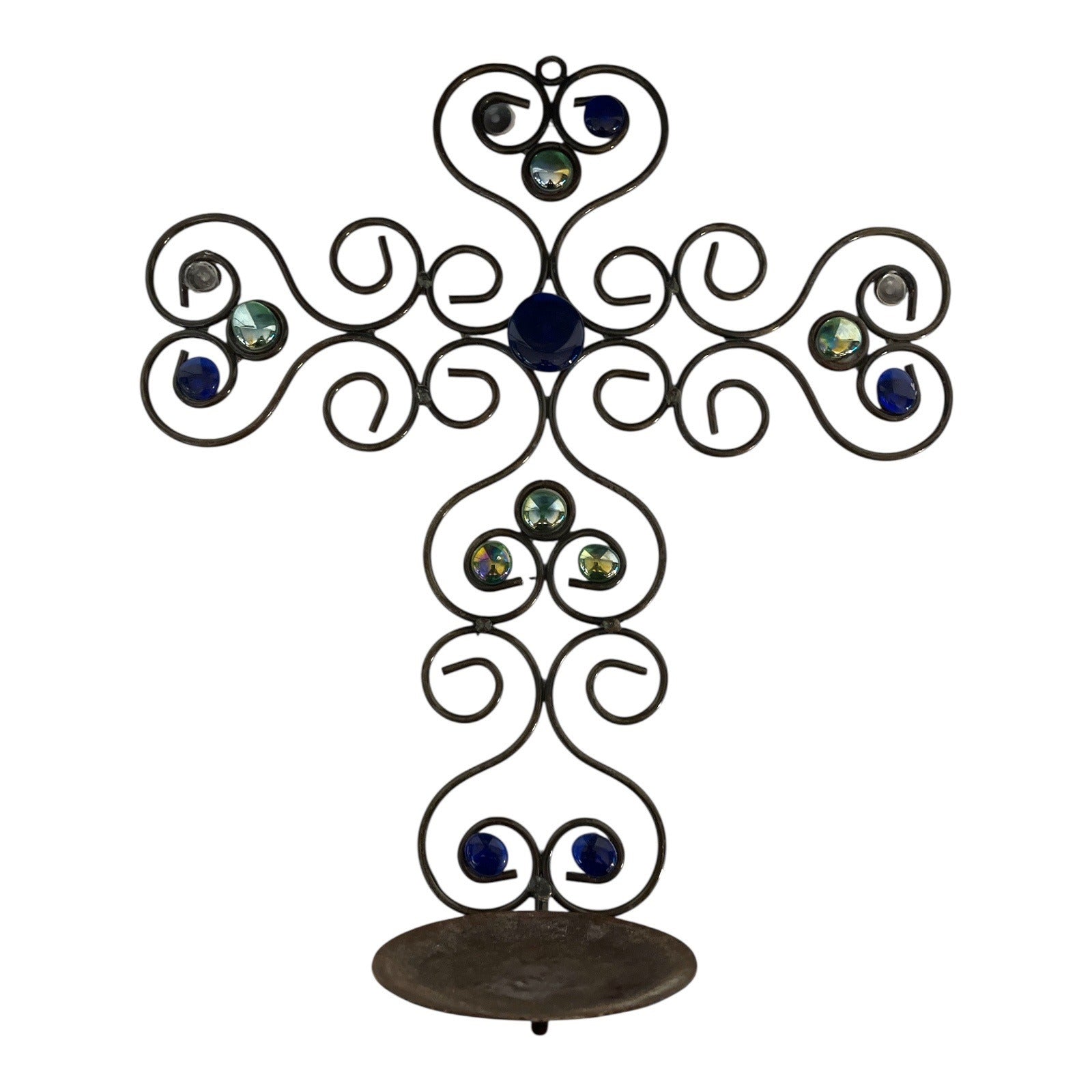 Vintage Wrought Iron Wall Cross Candle Holder – 16” x 14” with Blue & Iridescent Glass Cabochons (Some Missing)