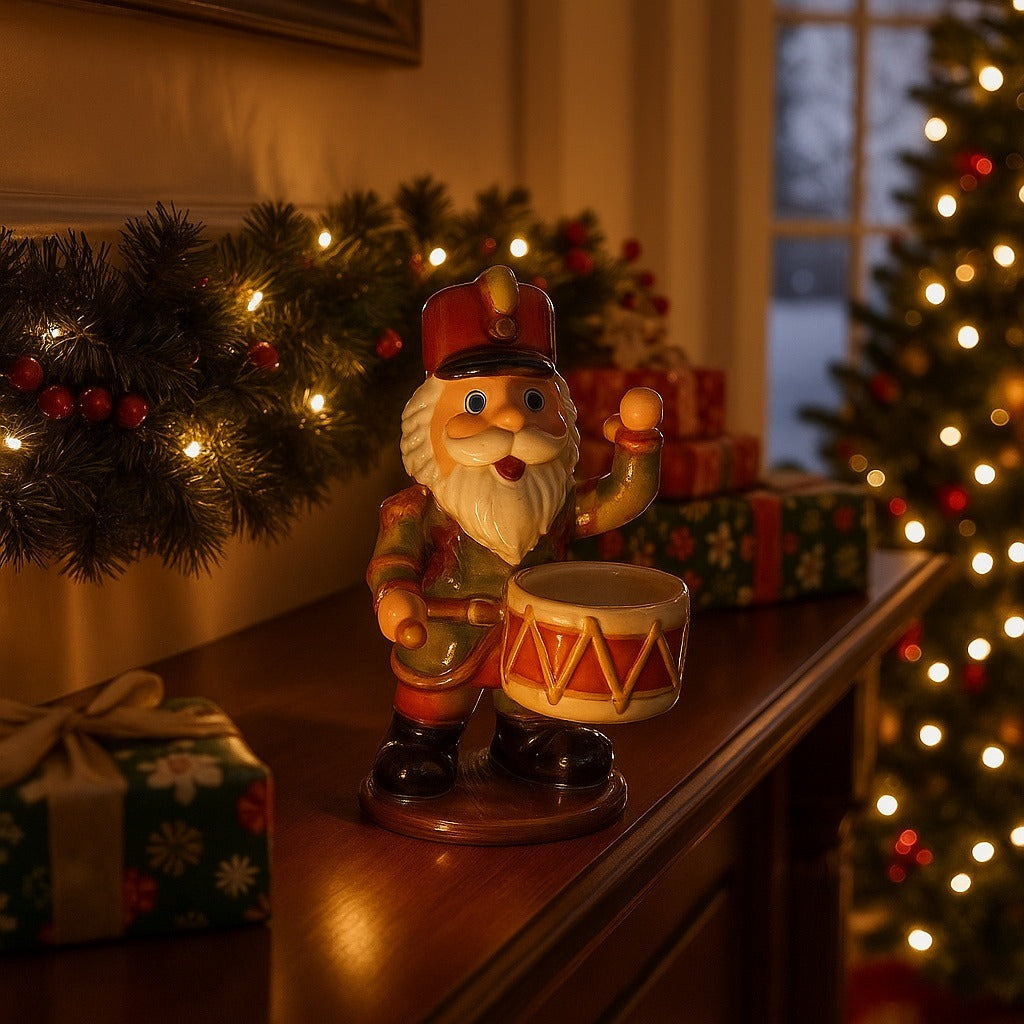 Charming nutcracker figurine holding a drum-style tea light cup. Made exclusively for Yankee Candle and finished in classic holiday colors with glossy glaze accents. A festive addition to Christmas décor.