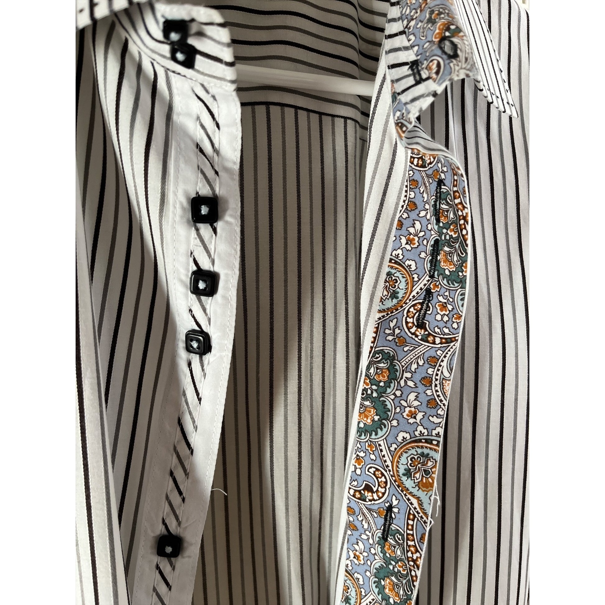 Sophisticated Vizoni Uomo men’s dress shirt featuring a black and white vertical stripe design with a contrasting paisley print inside the collar, cuffs, and placket. Crafted from a cotton-polyester blend for comfort and durability, this stylish shirt is finished with square black buttons and a modern fit that pairs perfectly with jeans or dress pants.