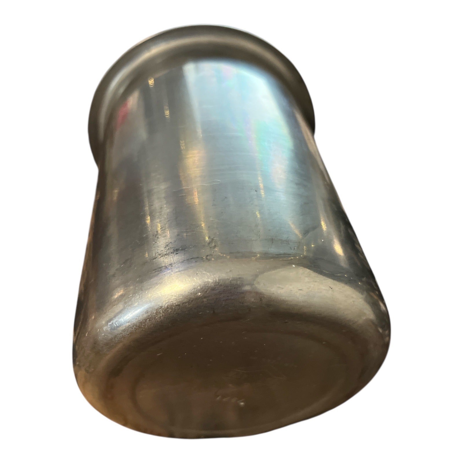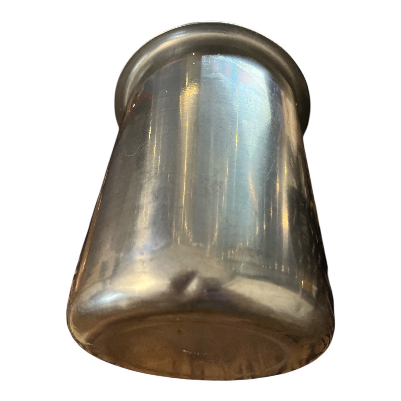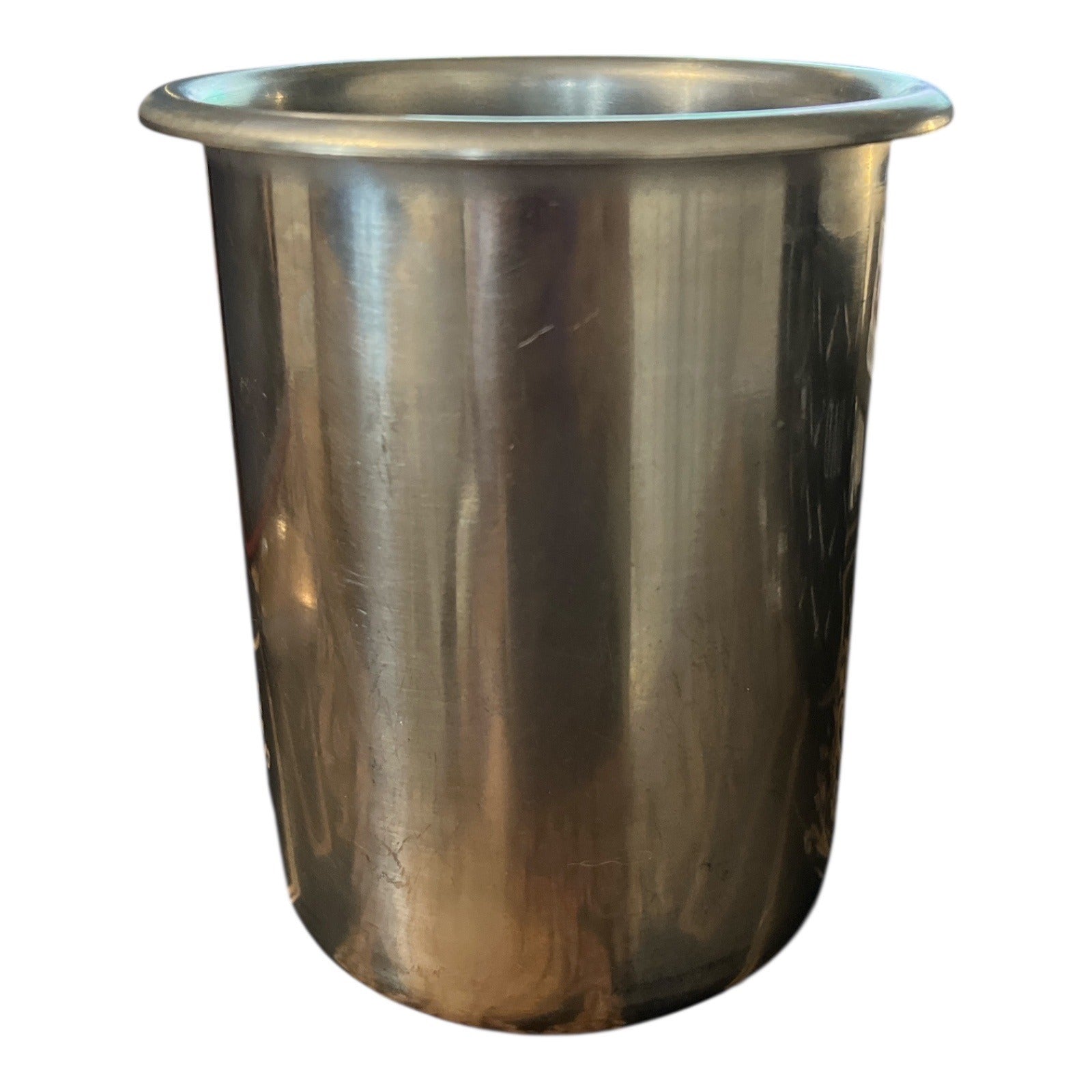 This vintage Vollrath stainless steel Bain Marie pot, model #7871, holds approximately 1.25 quarts and is ideal for commercial kitchen use or as a heavy-duty utility insert. Made in the USA, it features a flared rim and durable stainless steel construction.