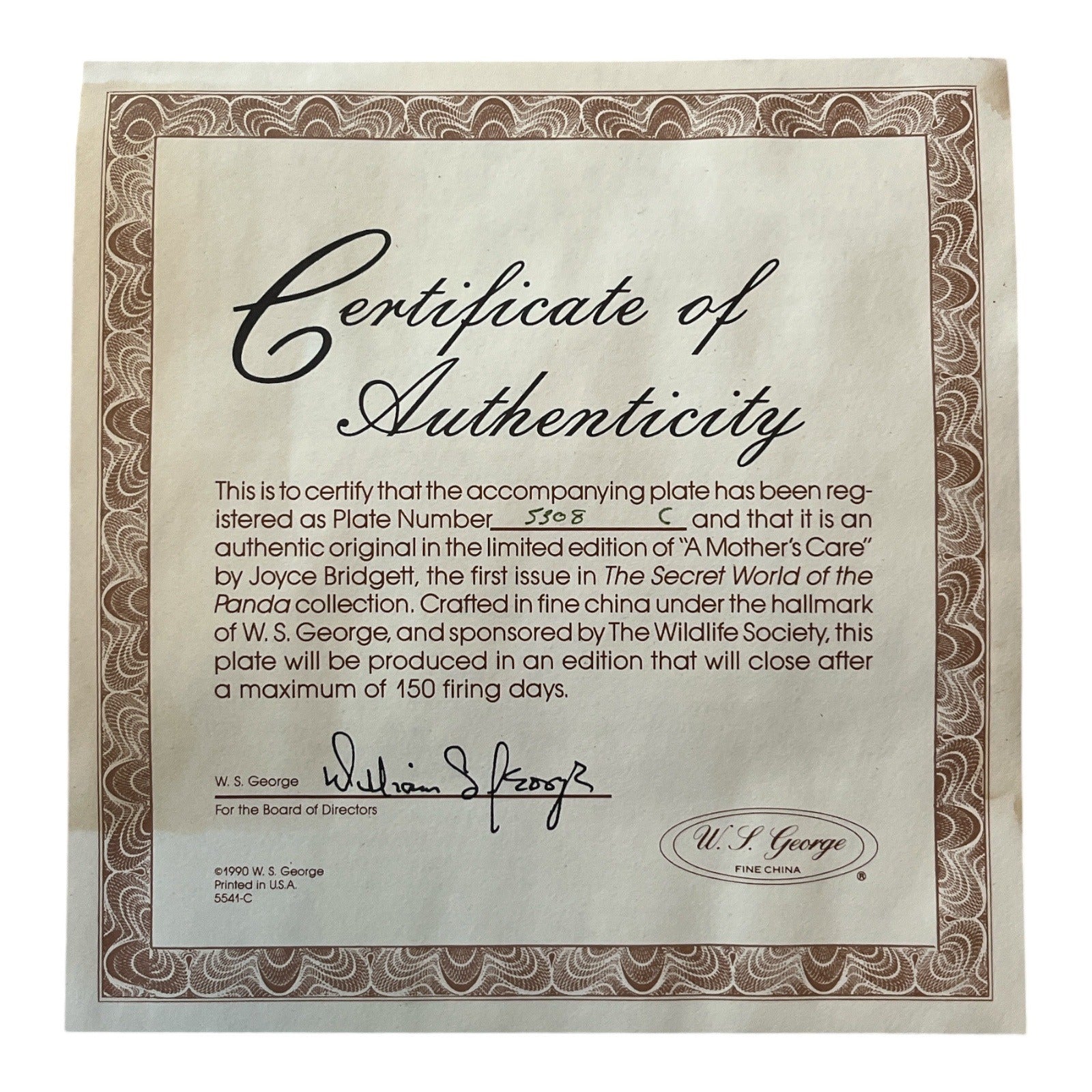 VTG 1990 Joyce Bridgett Panda Collector Plate “A Mother’s Care” W\.S. George w/COA