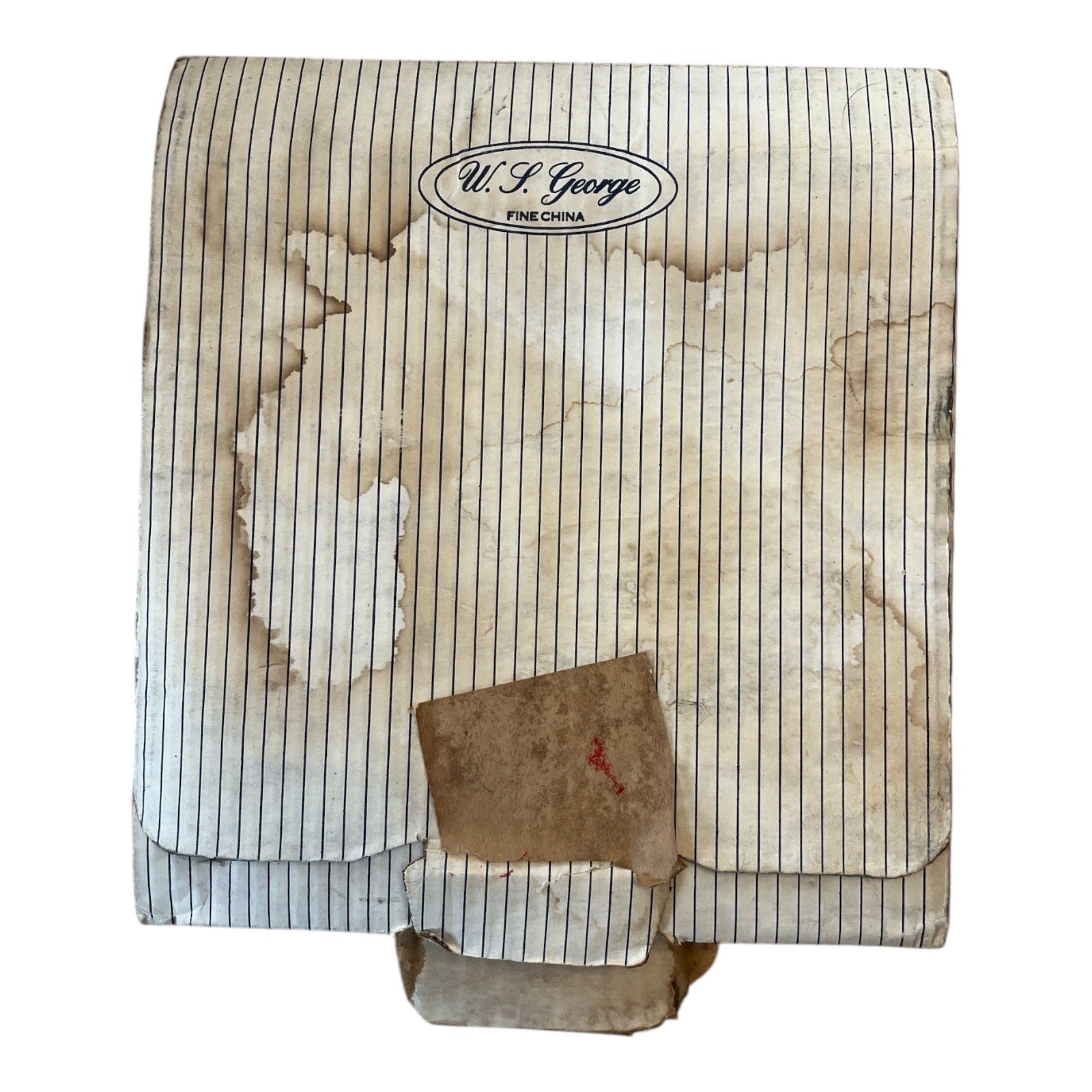 The plate is in excellent condition, with no chips, cracks, or repairs. Includes paperwork. The original shipping box has significant age-related staining and wear but is intact.