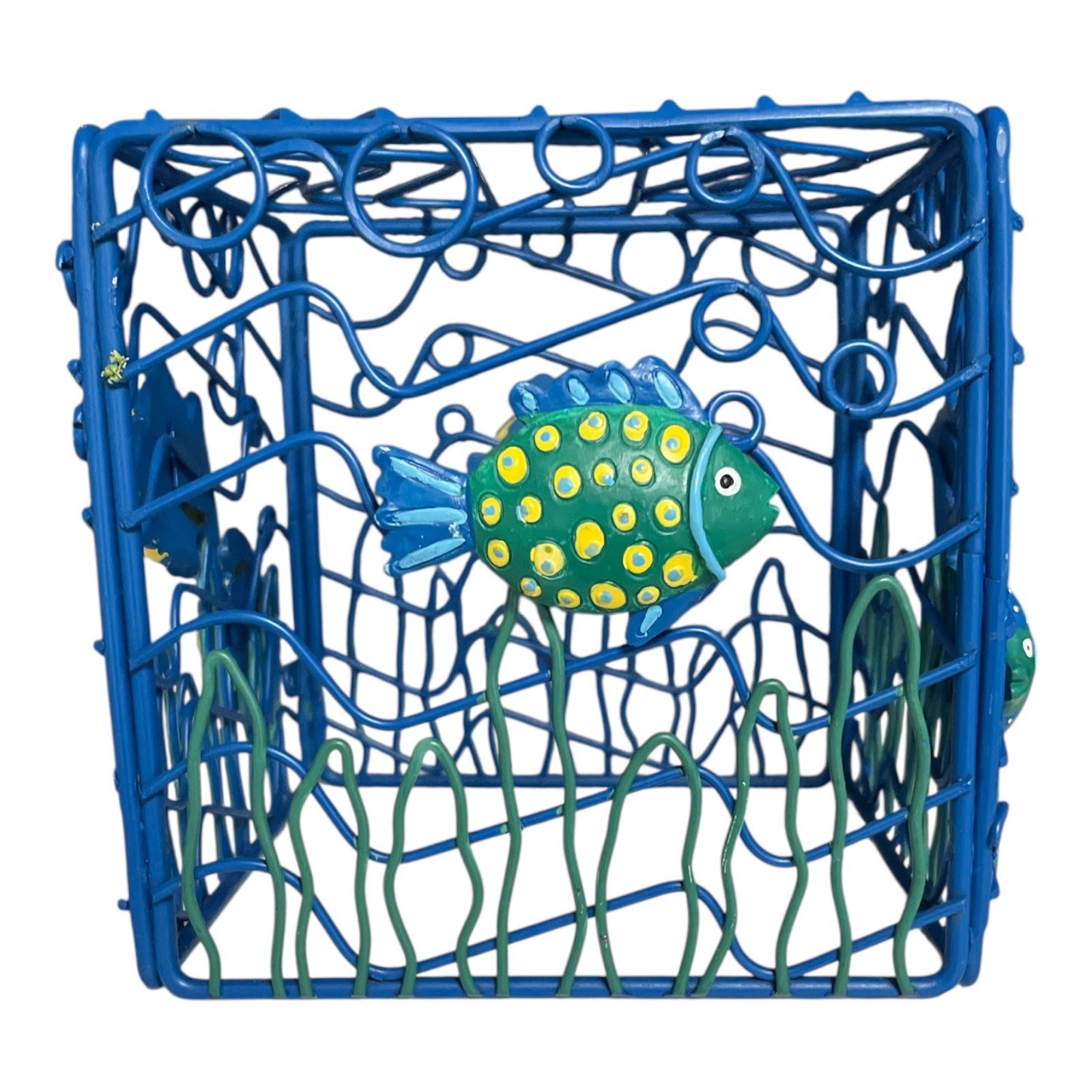 Vtg 1990s Handpainted Metal Fish Wire Basket – 6x6 Ocean Theme Coastal Decor