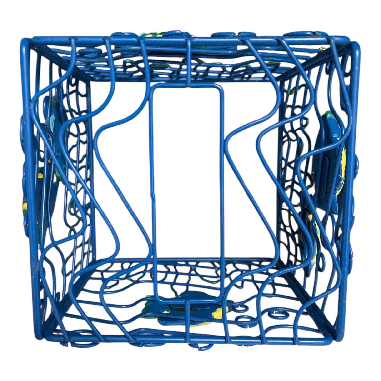 Bring playful coastal charm to your space with this vibrant vintage metal wire basket, handpainted with whimsical fish on every side. Dating to the 1990s–early 2000s, this cube-shaped basket features bright shades of blue, yellow, green, and teal, making it perfect for beach-themed decor or functional storage.